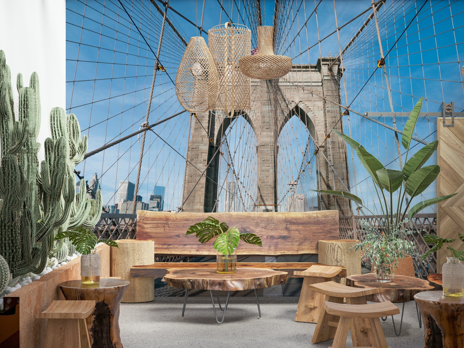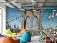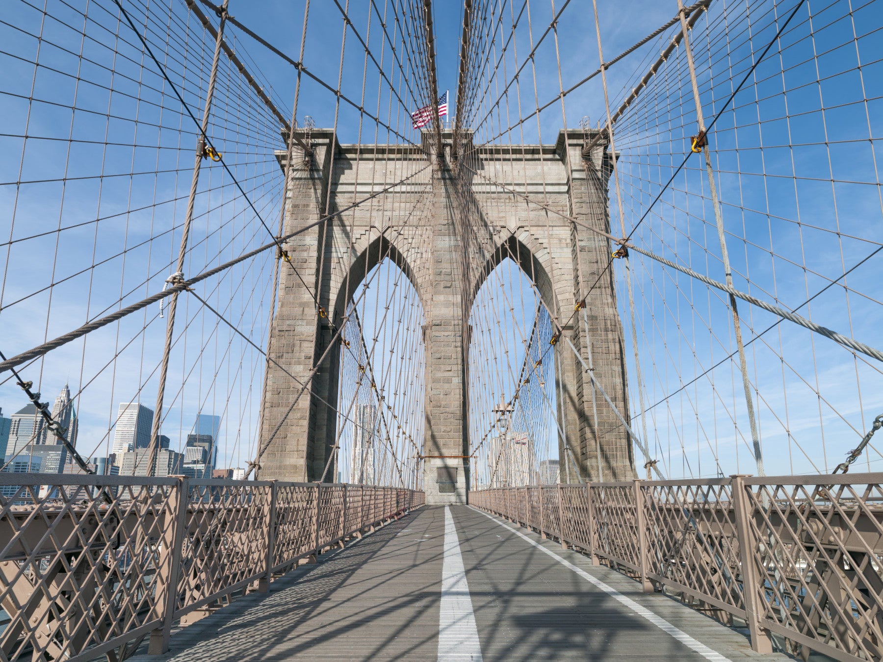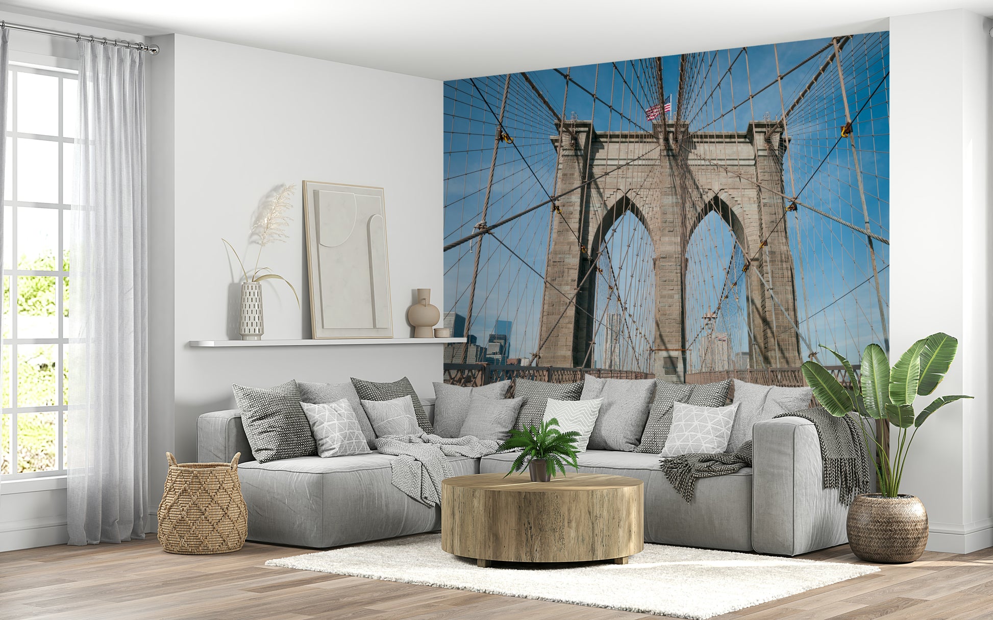 Pedestrian walkway on Brooklyn bridge, New York. Immerse yourself in the urban serenity with "Strolling Across the Brooklyn Bridge," a stunning vista capturing the iconic landmark. Feel the gentle breeze as you mentally traverse its historic walkway, the intricate web of cables stretching towards the brilliant azure sky above. The majestic stone towers stand proud, adorned with the American flag, emblems of strength and resilience. Below, the suggestion of the cityscape offers a subtle reminder of the vibrant life surrounding this tranquil haven. This image evokes a sense of peace and wonder, inviting you to bring the grandeur and timeless elegance of New York City's architectural marvel into your personal space. Transform any room into an inspiring sanctuary with this captivating portrayal of one of the world's most beloved bridges.