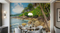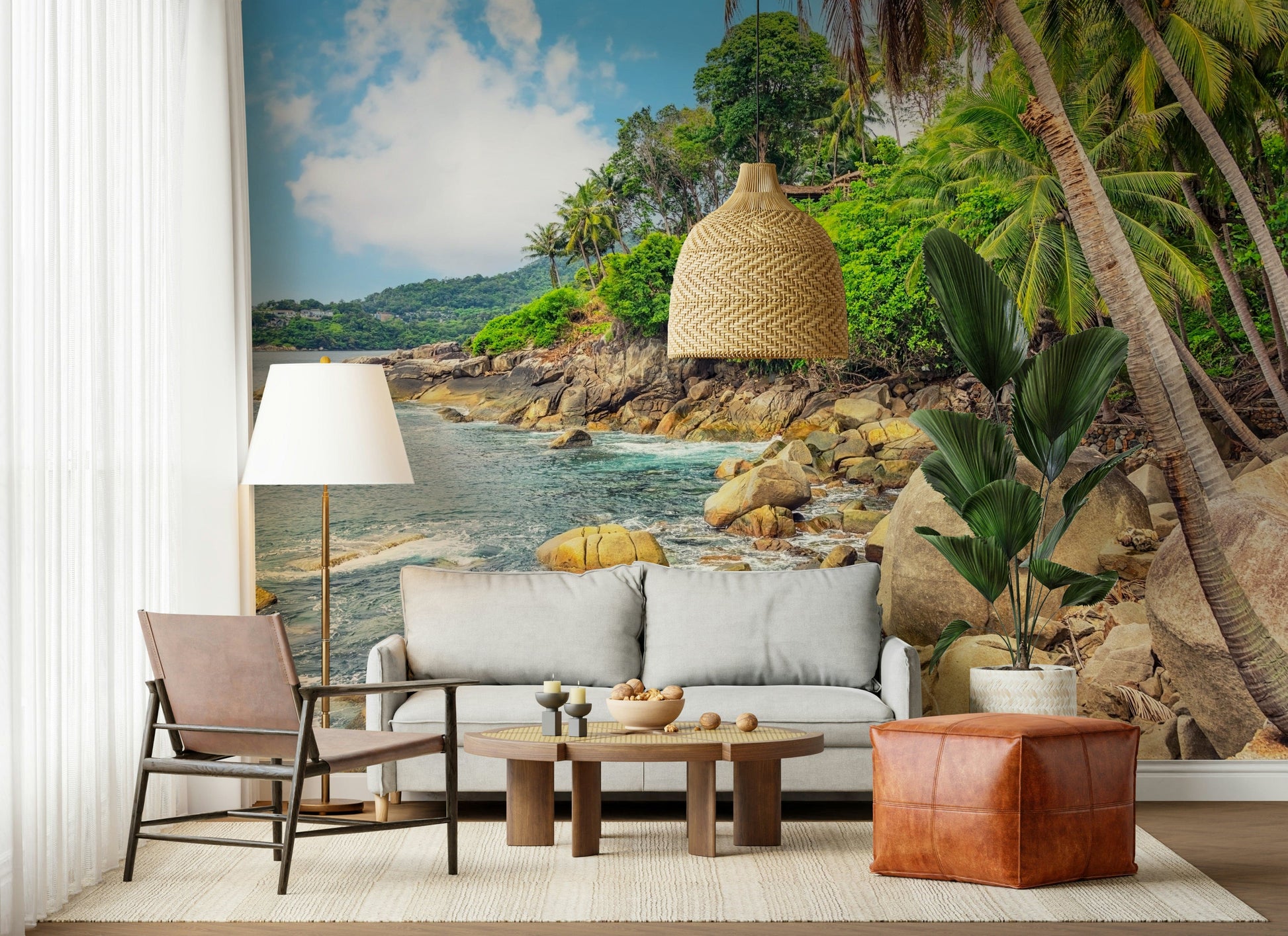 このトロピカルな海岸線のデザインで、ご自宅にビーチを。ヤシの木や岩山の繊細なディテールがリアルな奥行きを演出し、どんな壁も美しい景色へと変貌させます。鮮やかで鮮やかな色彩は、どんなお部屋の雰囲気も高め、リビングルームや寝室に最適です。この壁紙は、モダンにもラスティックにもマッチする、フレッシュでナチュラルな要素をプラスします。風通しの良い開放的な雰囲気を演出し、狭い部屋や自然光が入りにくい部屋に最適です。