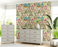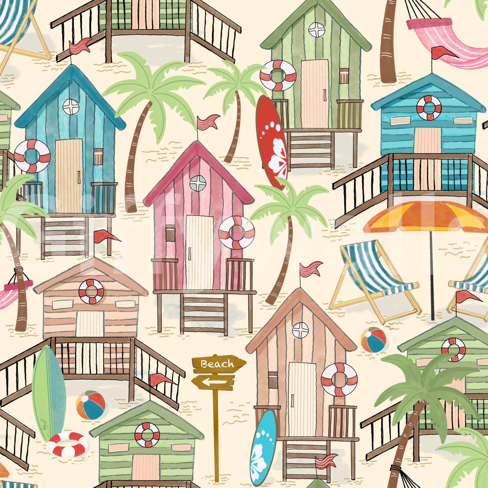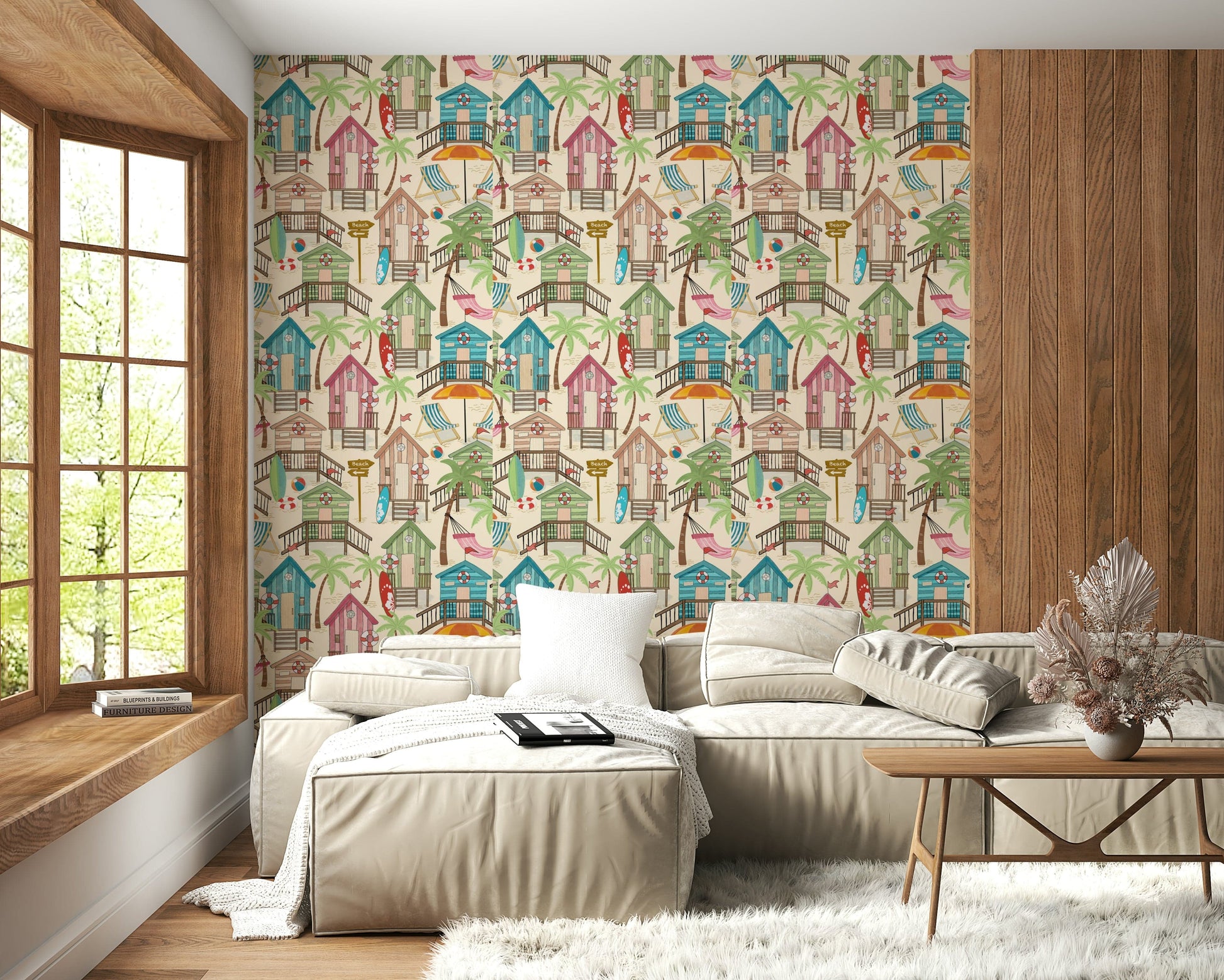 Bring a touch of coastal charm to your home with this vibrant beach hut wallpaper. The playful design showcases colorful beach huts, palm trees, surfboards, and seaside accessories. The pattern features cheerful colors. This wallpaper for walls instantly creates a relaxed and fun atmosphere. It is ideal for kids' rooms, bathrooms, or any space where you want to evoke a vacation vibe. The pattern blends well with light wood furniture and nautical-themed decor.