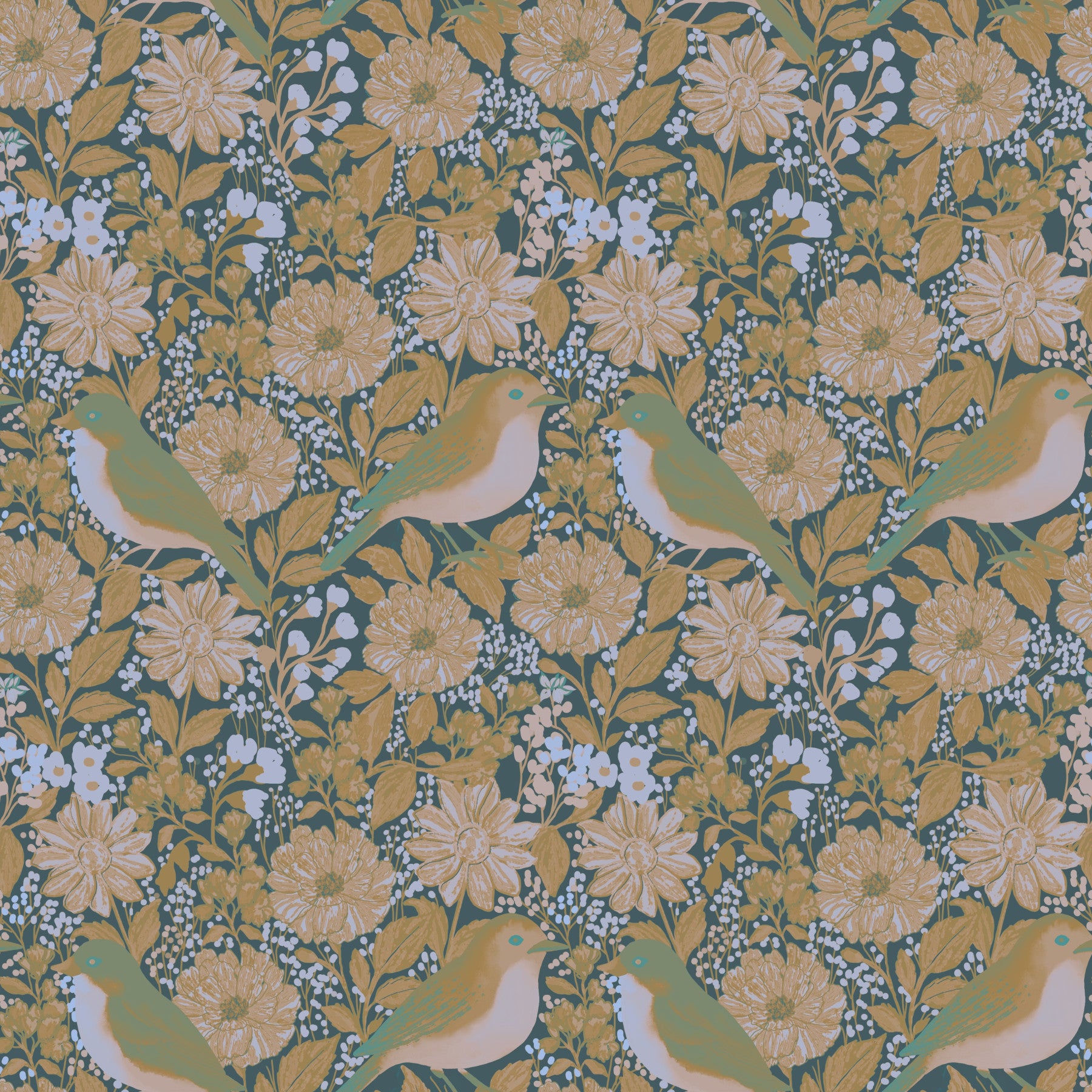 Bring the tranquility of nature indoors with this charming floral and bird-themed wallpaper for walls. Soft gold and teal shades create a peaceful ambiance. The delightful floral design offers a visual rhythm. It's ideal for bedrooms, living rooms, or any space craving a calm, organic touch. This captivating wallpaper complements interiors with its gentle colors and balanced composition, providing a soothing, stylish backdrop.