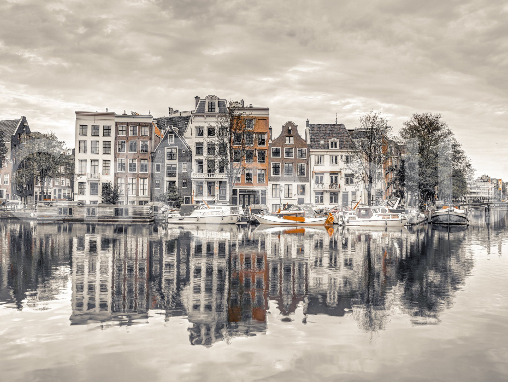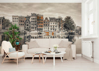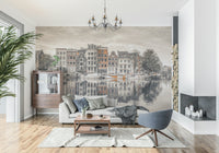 Elevate your home decor with this harmonious urban wallpaper for walls. This captures the architectural beauty of Amsterdam's canals and its tranquil water reflections. The wallpaper features a muted color palette, with subtle pops of terracotta that bring calmness and character to any space. It works beautifully in living rooms, bedrooms, or home offices, providing a peaceful, sophisticated backdrop. The reflections enhance depth, while the architectural details add a touch of classic European charm. This wallpaper complements any interior style, adding refined interest.