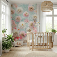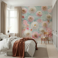 Dahlia Flowers, Full Frame. Transform your living space into a serene garden with this captivating "Dahlia Flowers" design. A watercolour-inspired aesthetic infuses your walls with a soft and dreamy atmosphere, creating an ambiance of tranquility. The delicate arrangement of dahlia blooms, rendered in shades of blush pink, crisp white, and subtle apricot tones, brings a touch of natural elegance to any room. The background, a gentle wash of seafoam green, provides a calming contrast, accentuating the floral details and adding depth to the composition. The scattered blossoms create a visually appealing rhythm, inviting the eye to wander and discover new details within the intricate petals and nuanced textures. This wall décor choice exudes a timeless charm, perfect for creating a relaxing and inviting atmosphere.