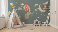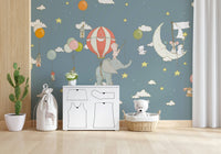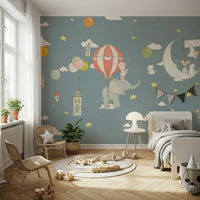 Embark on a whimsical journey with this charming wallpaper for walls, featuring adorable animals soaring through a starlit sky. Houses drift gently from colorful balloons, while an elephant carries a playful piglet beneath a striped hot air balloon. Mice sail on a crescent moon boat. The soft gray-blue background accented with yellow stars creates a serene and comforting ambiance. Perfect for a nursery, kids' room, or playroom, this design sparks imagination and adds a touch of magic to any interior.