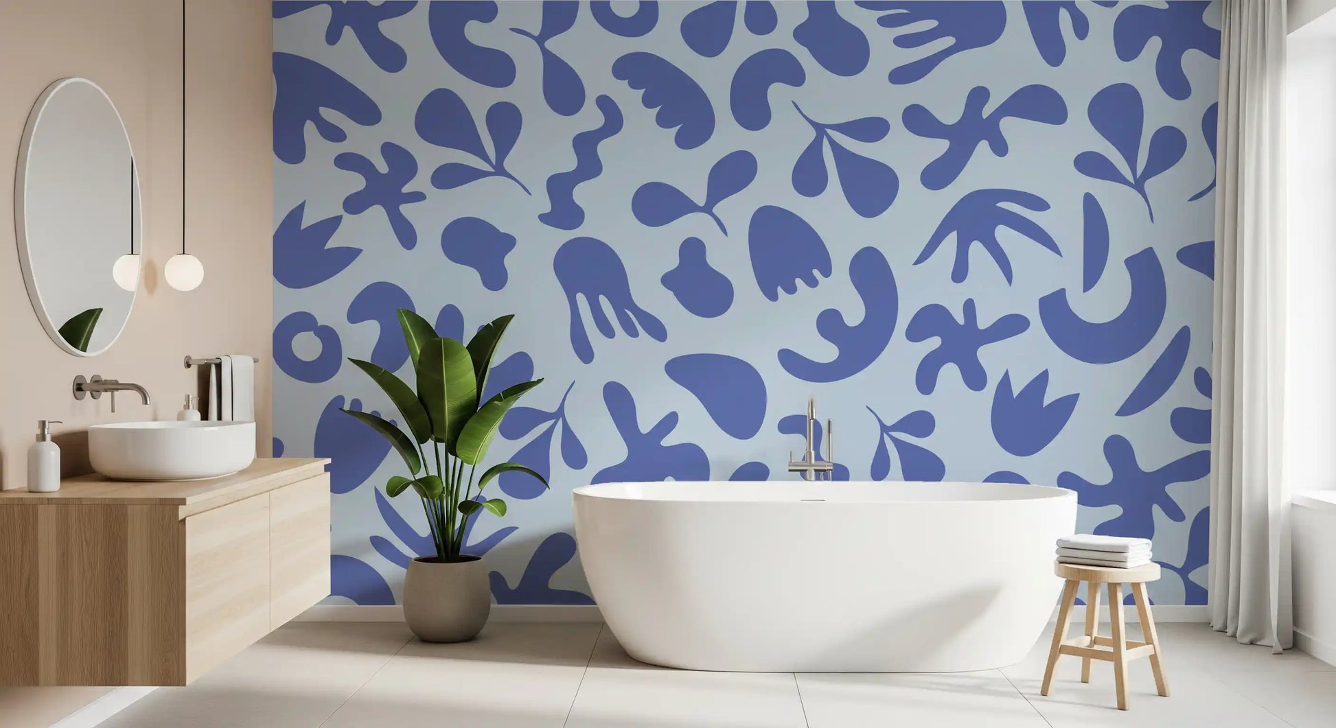 Forvandle ditt oppholdsrom med dette fengslende tapetet for vegger, som har et utvalg av organiske, flytende former som danser over en myk, beroligende bakgrunn. Designet bruker to harmoniske nyanser av blått og lavendel, og skaper en monokromatisk, men likevel dynamisk visuell opplevelse. Dette moderne og kunstneriske mønsteret tilfører et lekent preg til ethvert rom uten å dominere den eksisterende innredningen. Perfekt for et rolig soverom, et inspirerende hjemmekontor, et lekent barnerom eller en innbydende stue, komplementerer dette tapetet ulike interiørstiler. Det sømløse designet forbedrer rom med en følelse av rolig sofistikasjon og moderne sjarm, og inviterer til en avslappet atmosfære.