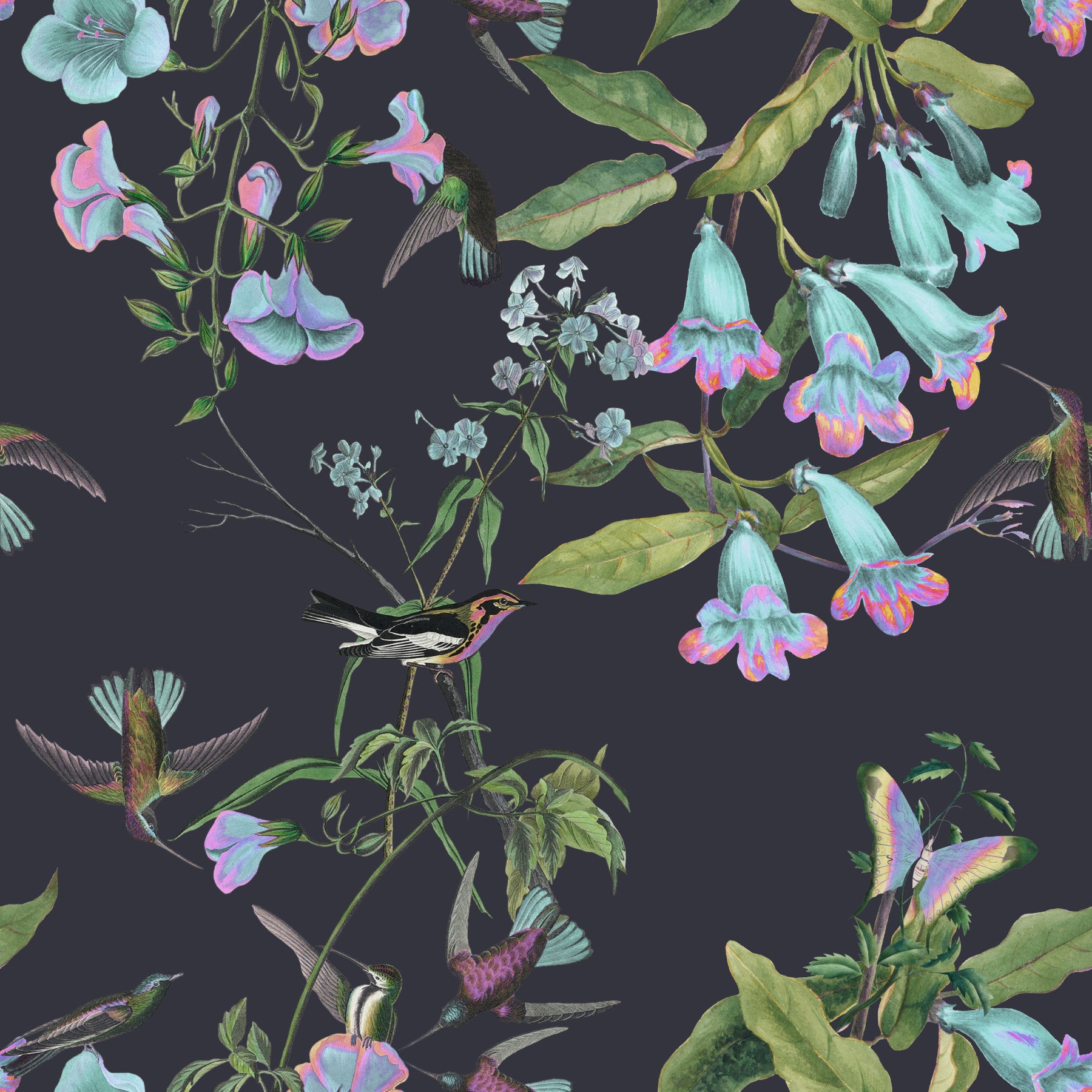 Turn your home into a botanical paradise with this vibrant design. Graceful hummingbirds flit among colorful blooms. The watercolor style brings a soft, artistic feel to this lively scene. Ideal as wallpaper for walls in living rooms or bedrooms, this design offers a touch of classic nature. Its dark background enhances jewel-toned accents. It is a wonderful complement to interiors with a touch of color and luxury, adding intrigue to any space.