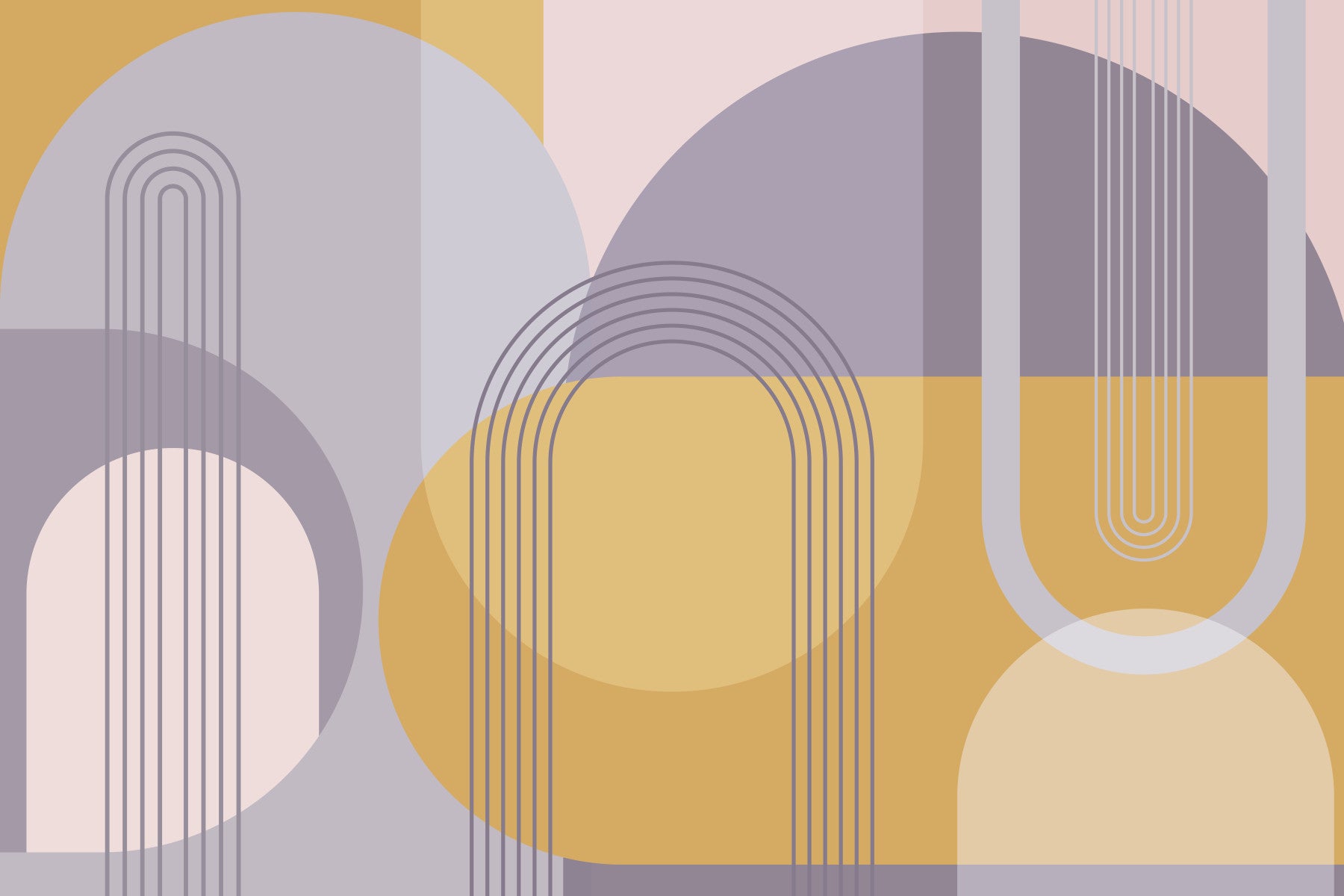 Inspired by mid-century modern design, this wallpaper features a sophisticated blend of geometric shapes and a muted color palette. The overlapping circles and arches create a dynamic yet balanced composition. The soft yellow and lavender hues are calming and inviting, while the subtle grey lines add a touch of understated elegance. Perfect for adding a touch of retro-chic to your home, this wallpaper is ideal for those who appreciate clean lines and a sophisticated aesthetic. Its versatile design makes it suitable for various spaces, including living rooms, bedrooms, and even home offices.