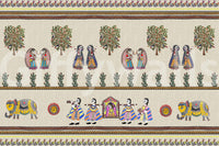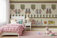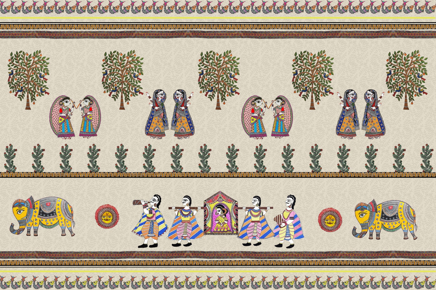 Adorn your walls with the regal charm of "Mithila Majesty". This artwork captures the essence of traditional Mithila art, depicting a vibrant procession steeped in culture and heritage. Majestic elephants, adorned with intricate patterns, stand guard alongside scenes of palanquins carried with reverence. Stylized figures engaged in dance and celebration are interspersed with trees bearing the bounty of nature, all rendered in a palette that echoes the warmth of the Indian sun. Delicate borders featuring stylized flora and fauna further enhance the visual storytelling. This wall covering transforms any space into a gallery, showcasing the enduring artistry and captivating narratives of the Mithila region. Invite a touch of timeless elegance and cultural richness into your living space with this extraordinary piece.