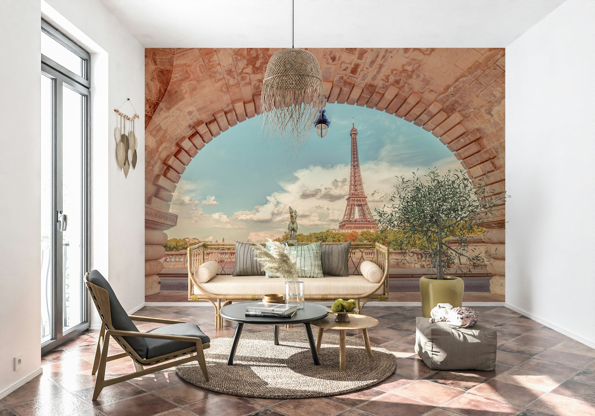 Eiffel Tower from Bir-Hakeim Bridge, Paris, France. Transform your space with this enchanting wallpaper for walls, capturing the timeless allure of Paris. The iconic Eiffel Tower rises majestically, framed by an elegant stone archway and soft, pastel skies. Earthy peach and beige tones blend with touches of green, creating a serene and sophisticated atmosphere. Perfect for living rooms, bedrooms, or hallways, this wallpaper adds a touch of Parisian romance to any interior. It complements both modern and classic styles, making your walls a captivating focal point.