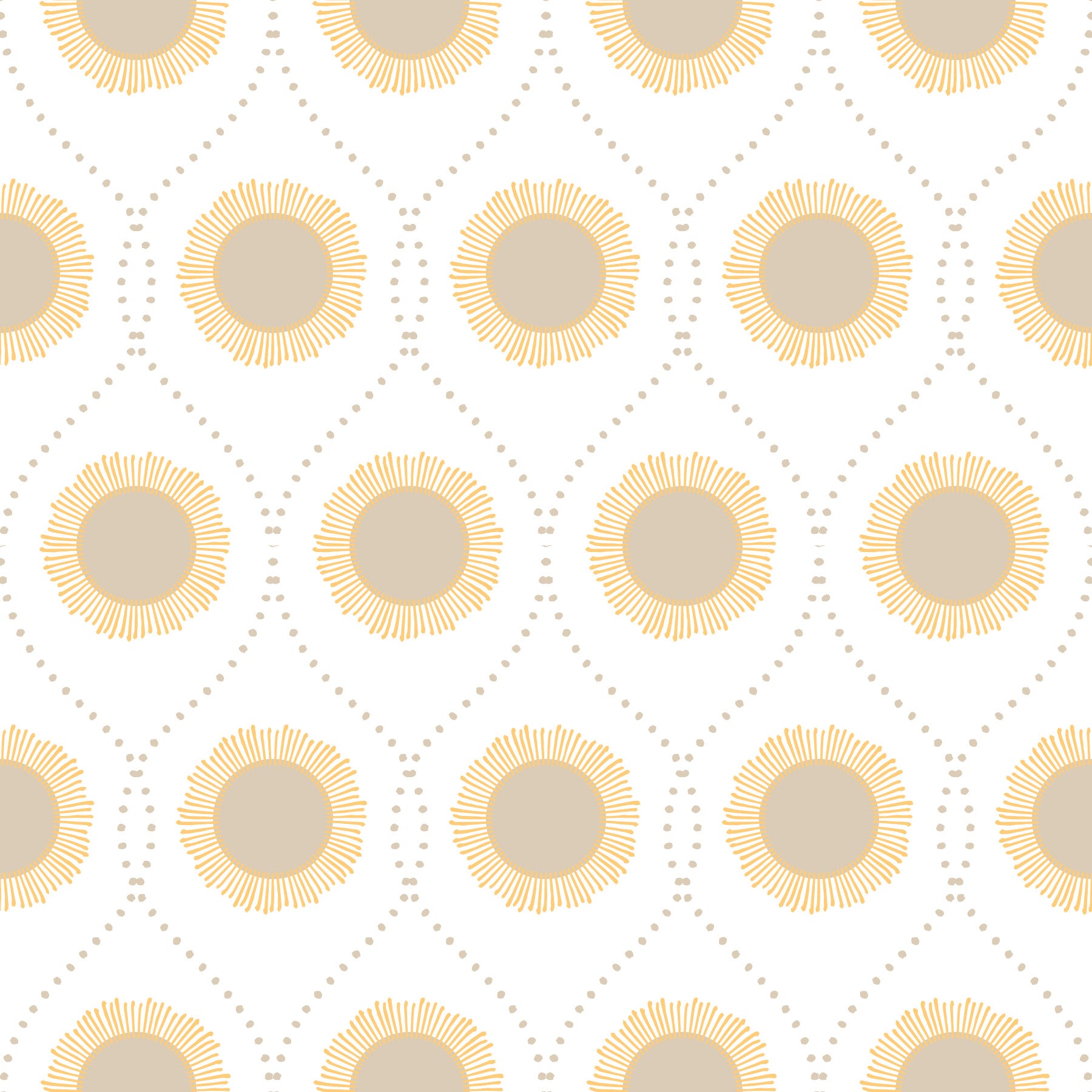 This charming wallpaper design features sunbursts in a soft beige hue, creating a warm and inviting ambiance. The dotted lines form a subtle geometric pattern that balances the design and adds visual interest. It is a great wallpaper for walls in a bedroom, nursery, or living room. The gentle color palette suits Scandinavian and boho decors. Use this pattern to add a touch of warmth to any room.