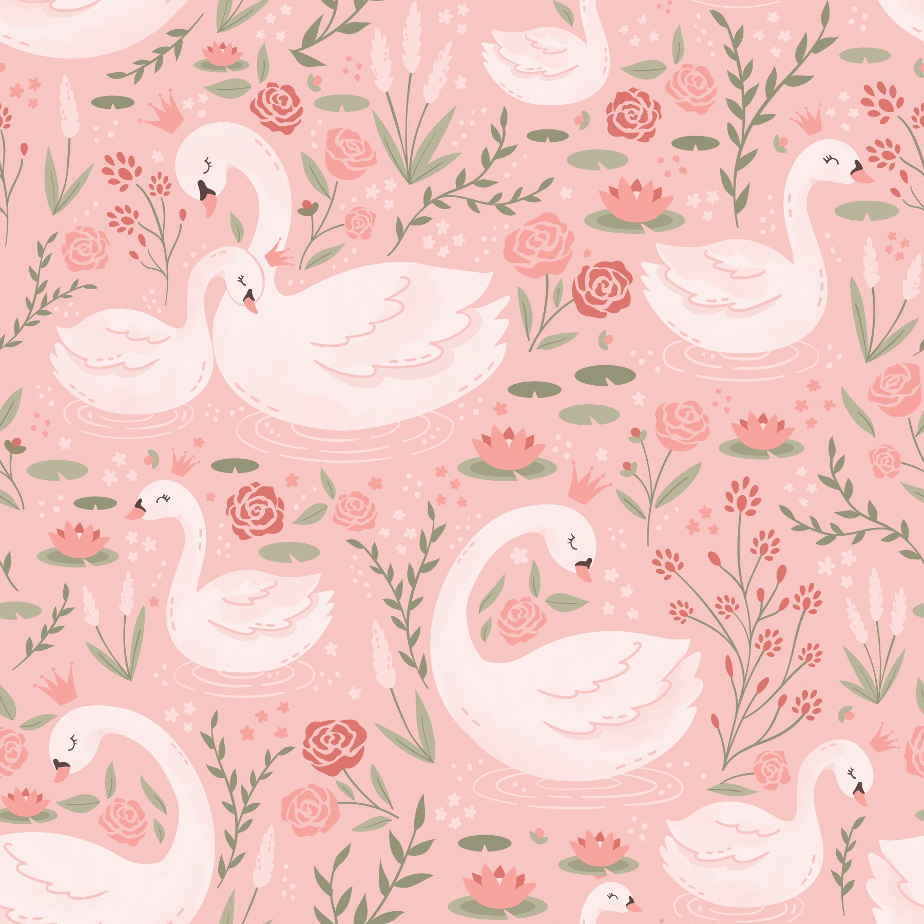 Artistic swan pattern with warm pink tones and gentle floral accents.