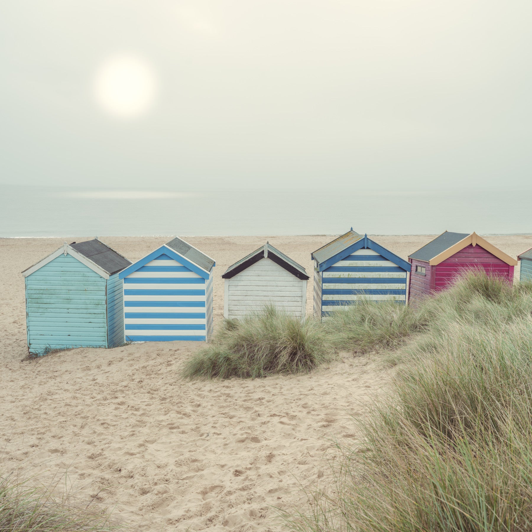 Beach huts on sandy seashore. This beach hut row captures the essence of seaside living. A row of colorful huts faces the sea, set against soft sand and a muted sky. The simple design brings a sense of calm. Perfect as wallpaper for walls in a bedroom, a children's room, or even an office, this design can transform any space with its coastal style. It suits interiors with a nautical or playful design theme.