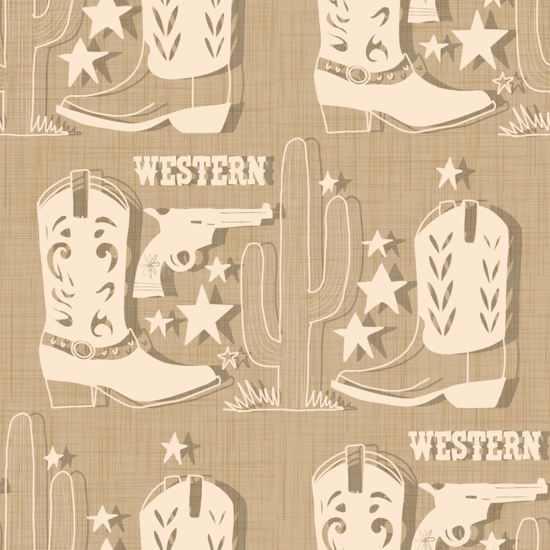 Western-themed wallpaper featuring boots, pistols, and cacti in a subtle tonal pattern.