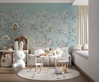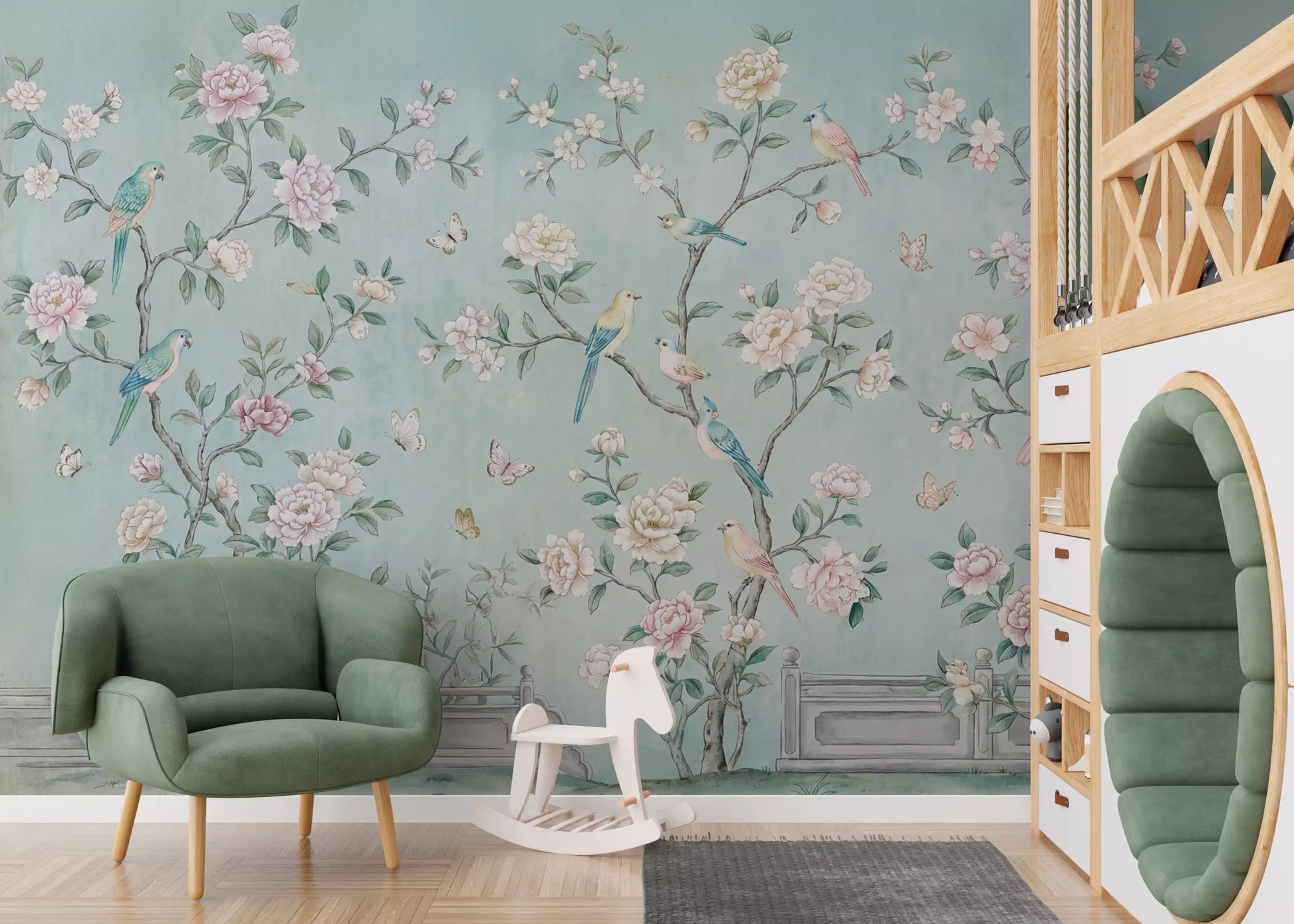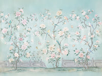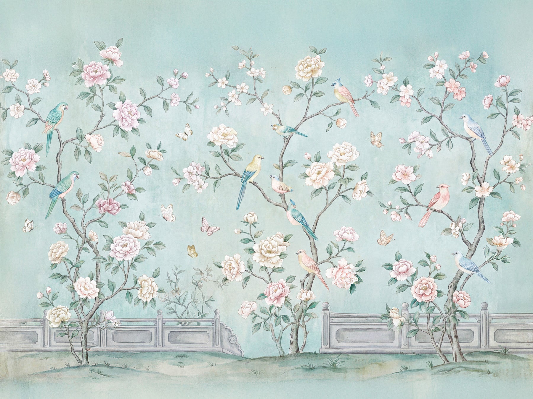 Forvandle ditt oppholdsrom med dette utsøkte tapetet inspirert av Chinoiserie. Delikate håndmalte fugler sitter blant blomstrende peoner og kirsebærblomster, og skaper en fredelig hagescene. Sommerfugler svever grasiøst mot en myk teal bakgrunn, mens en subtil steinbalustrade forankrer komposisjonen. Akvarellkunsten gir en eterisk kvalitet, med en harmonisk palett av blushrosa, kremhvitt, myke blåtoner og dempede grønntoner. Dette elegante designet løfter soverom, spisestuer eller gjestetoaletter, og tilfører en rolig, sofistikert sjarm til ethvert interiør. Det fyller hjemmet ditt med tidløs skjønnhet og et snev av eksotisk luksus, og inviterer fred og naturlig eleganse inn på veggene dine.