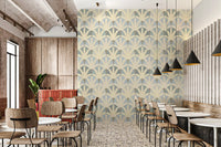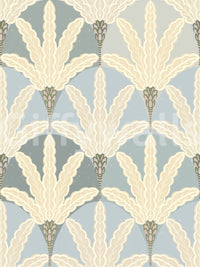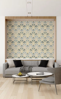 Denne utsøkte tapeten for vegger har et fengslende gjentakende mønster av stiliserte vifteformede blader og elegante sentrale knopper, med inspirasjon fra Art Deco og Art Nouveau estetikk. Designet viser dempede blekgule og kremfargede botaniske former mot en beroligende myk blågrønn bakgrunn, aksentert med subtile hint av støvete rosa og olivengrønt. Den slitte teksturen tilfører et snev av vintage sjarm, og skaper en sofistikert og rolig atmosfære i ethvert interiør. Dette designet fungerer vakkert i stuer, soverom eller spisestuer, og tilfører rommene en følelse av rolig eleganse. Det passer også godt i et koselig arbeidsrom eller en raffinert gang, og tilbyr tidløs visuell interesse og en sofistikert bakgrunn for ulike dekorstiler.