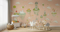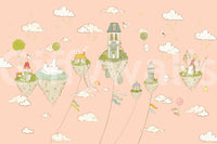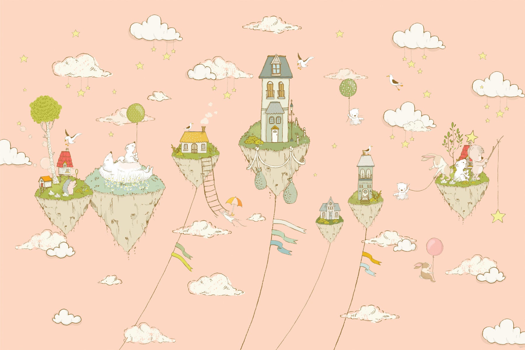 Enliven your space with this playful wallpaper for walls. This features quaint cottages perched on floating islands, complete with whimsical details like teddy bears, bunny rabbits, and clouds with dangling stars. The delicate lines and soft hues evoke a sense of calm and wonder. The design creates inviting spaces. It is perfect for a child's bedroom, playroom, or any area desiring a touch of storybook charm.