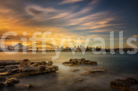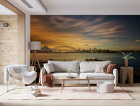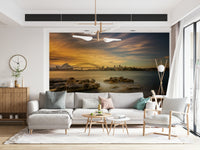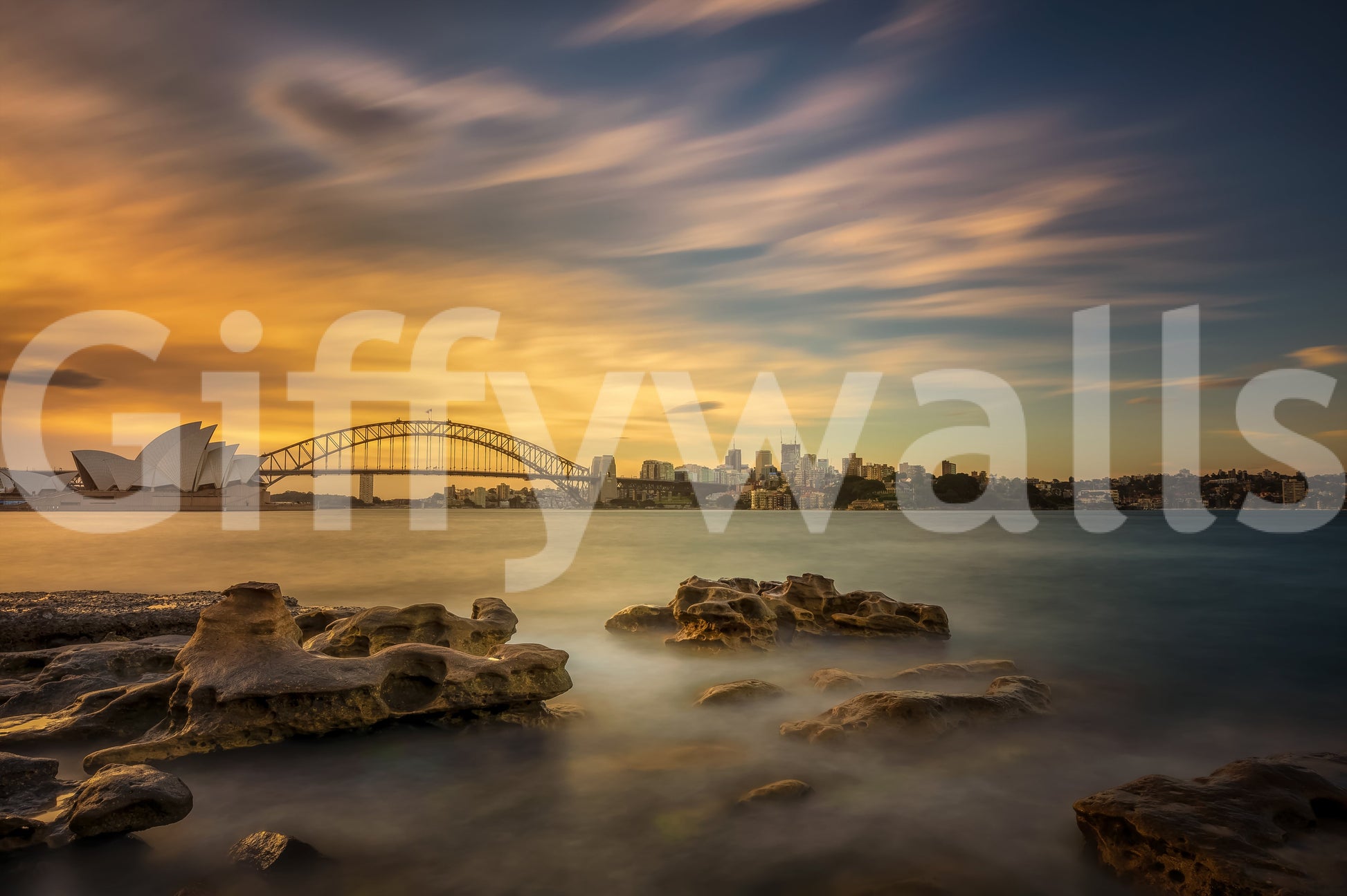 Immerse yourself in the captivating beauty of Sydney at dusk with "Sydney Sunset." This stunning wallpaper captures the iconic silhouette of the Sydney Opera House and Harbour Bridge bathed in the warm, golden hues of the setting sun. Wisps of clouds streak across the sky, painted in shades of orange, yellow, and soft blue, creating a dreamy and ethereal atmosphere. The foreground features rugged, textured rocks gently embraced by the silky smooth water, providing a grounding contrast to the vibrant sky. Feel the tranquility and grandeur of Sydney as the day gracefully transitions into night. This image is perfect for adding a touch of sophistication and serenity to your digital space, transporting you to the heart of one of the world's most beautiful cities every time you glance at your screen.