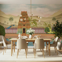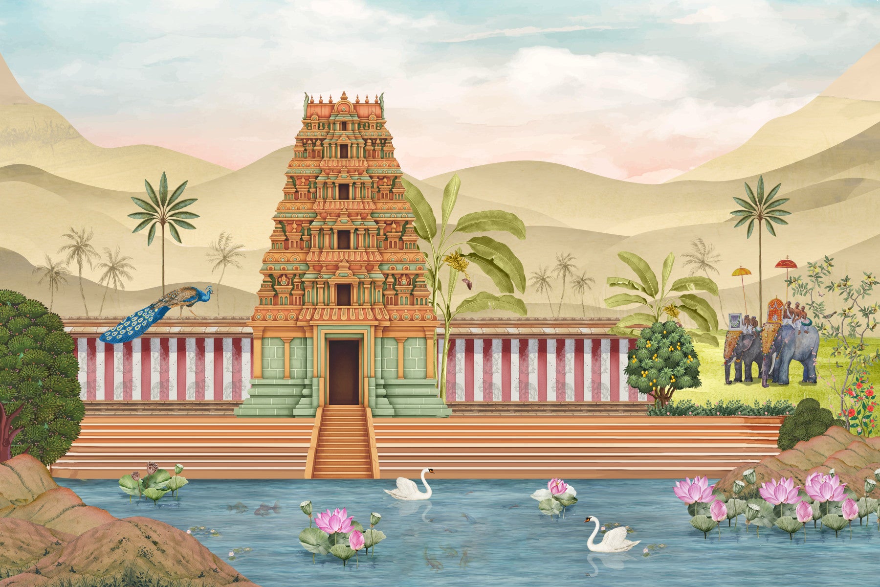 Adorn your walls with 'The Royal Pastoral,' a stunning vista that evokes tranquility and majesty. This scenic wall decor piece presents a meticulously detailed temple complex nestled within a serene landscape, transporting you to a realm of serene grandeur. The warm hues of the temple, contrasted against a backdrop of rolling hills and a soft, pastel sky, create an atmosphere of ethereal beauty. Graceful swans glide across a lotus-filled pond, while a majestic peacock adds a touch of vibrant color. In the distance, elephants adorned with royal regalia hint at a procession steeped in tradition. Infuse your space with the timeless elegance of this captivating pastoral scene, where nature and regal heritage intertwine seamlessly, offering a sense of peace and sophisticated charm.