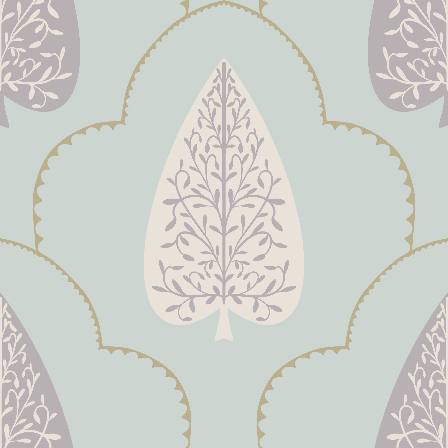 The Tranquil Trellis mural wallpaper introduces a calming and elegant atmosphere to any room. Its design features a beautifully stylized spade-shaped leaf, filled with intricate branching scrollwork, set within a classic ogee arch pattern. The serene color palette of soft aqua-mint, pale ivory, and a hint of dusty mauve creates a peaceful backdrop for your furnishings. This wall mural evokes a vintage feeling with refined botanical elements, offering a sophisticated alternative to plain walls. It is an exceptional wallpaper for walls in dining rooms, nurseries, or offices. Elevate your space with the subtle luxury and tranquil beauty of the Tranquil Trellis collection.