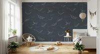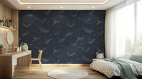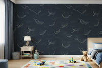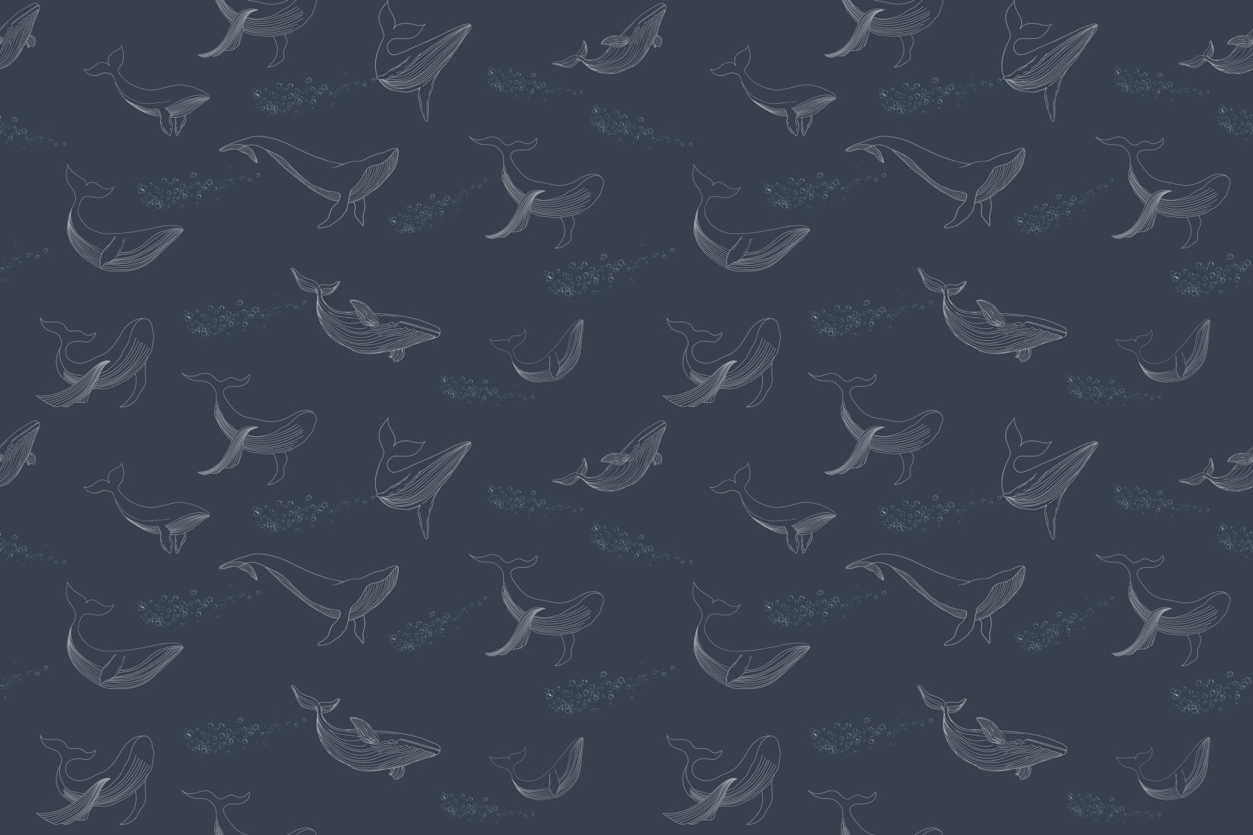 Transform your space with this serene whale-themed wallpaper for walls. The minimalist white line art against a deep navy background creates a calming, sophisticated atmosphere. Delicate bubble details add a touch of whimsy to the design. Ideal for nurseries, bathrooms, or bedrooms, this wallpaper brings a subtle marine charm to any room. Its neutral color scheme complements a variety of décor styles. This soothing pattern ensures a stylish, tranquil backdrop, enhancing the peacefulness and visual appeal of your interior. It pairs well with light wood and natural textures.