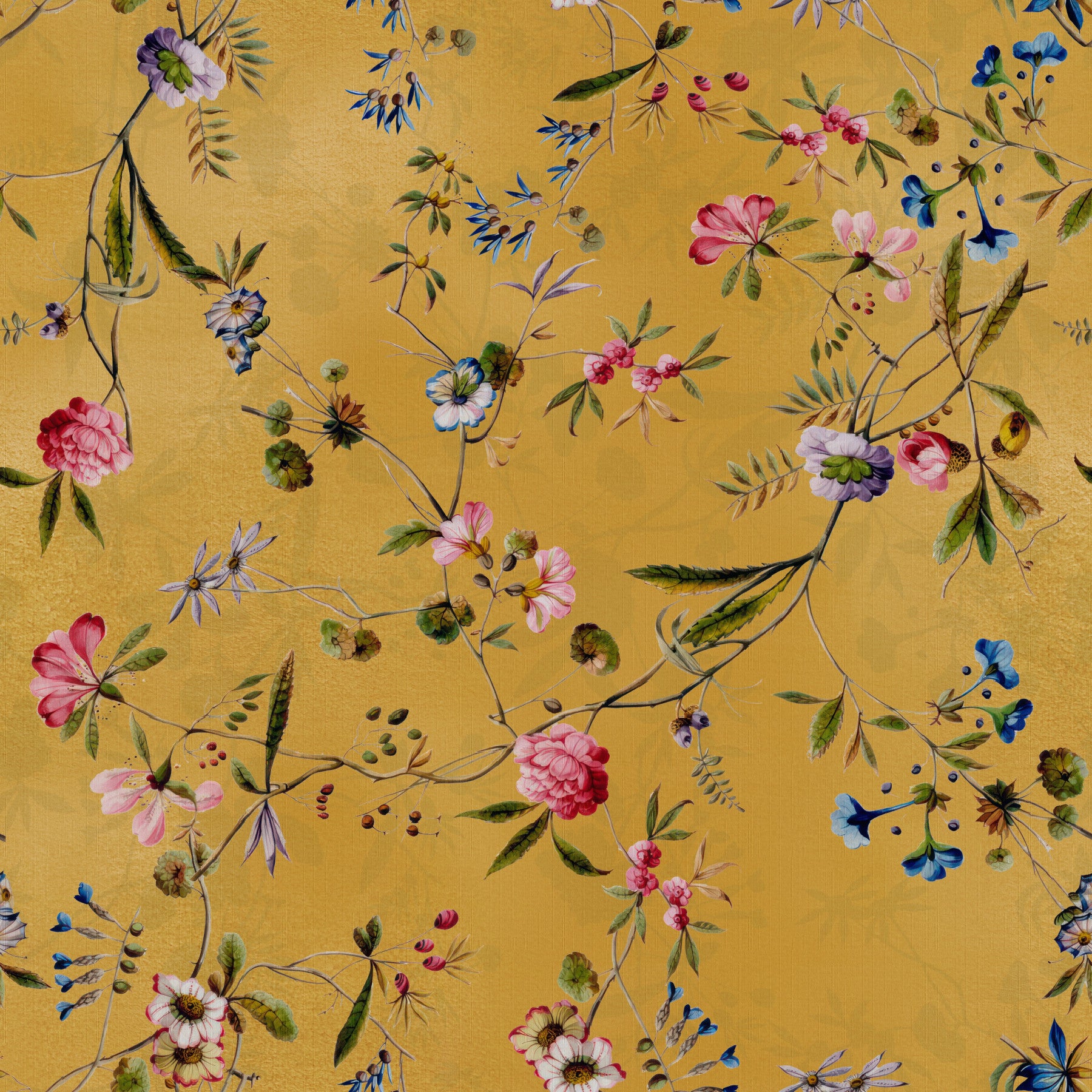 Inspired by the artistry of Chinoiserie, this wallpaper transports you to a serene garden. Intricate floral motifs in soft pinks, blues, and purples delicately dance across a warm gold background. The design's subtle elegance and timeless appeal create a feeling of calm and sophistication, adding a touch of old-world charm to any space. This wallpaper is perfect for those seeking a refined and understated aesthetic, offering a tranquil escape within the comfort of their home. The detailed botanical illustrations are beautifully rendered, bringing a touch of nature indoors.