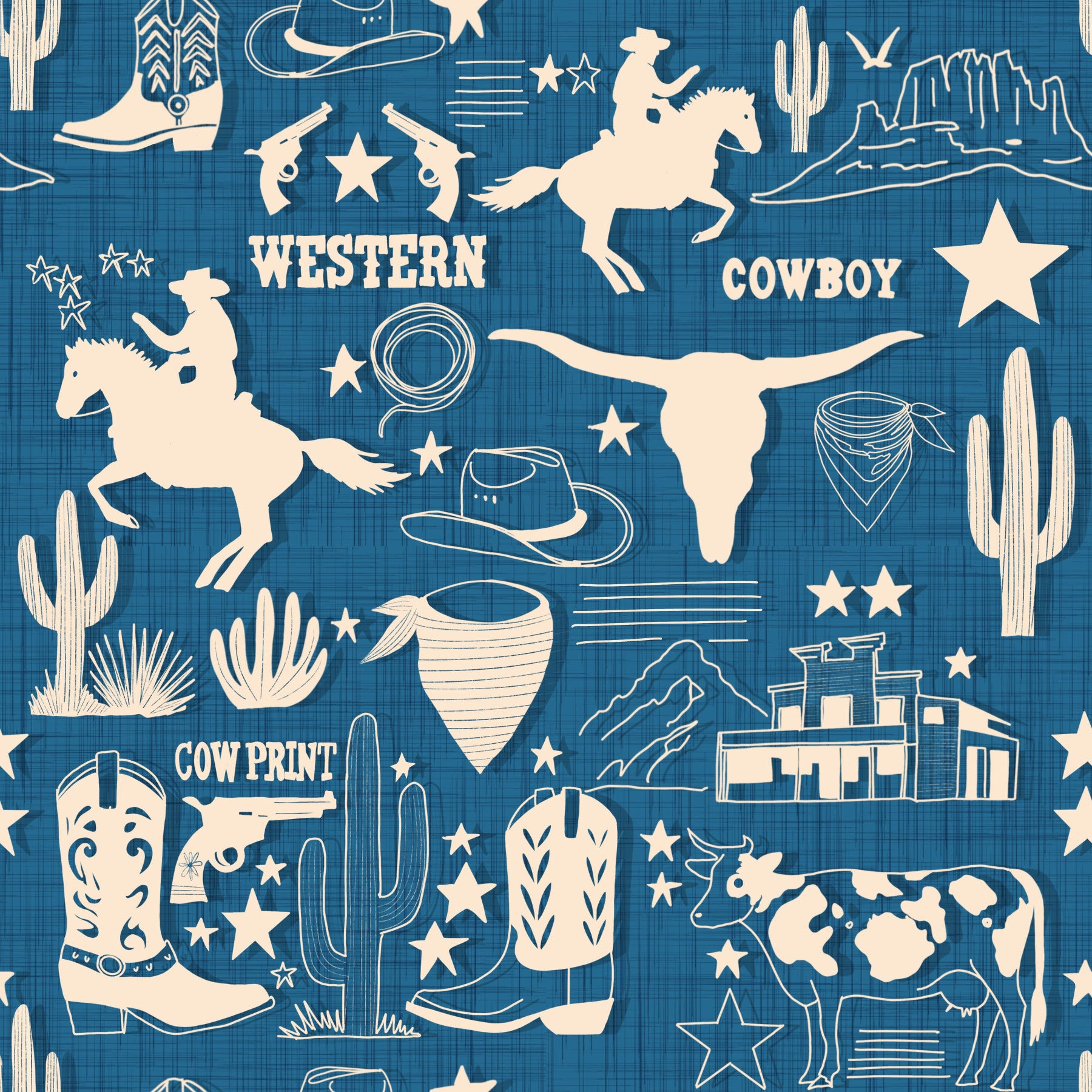 Wild West Blueprint wallpaper featuring cream cowboy motifs on a deep blue textured background.