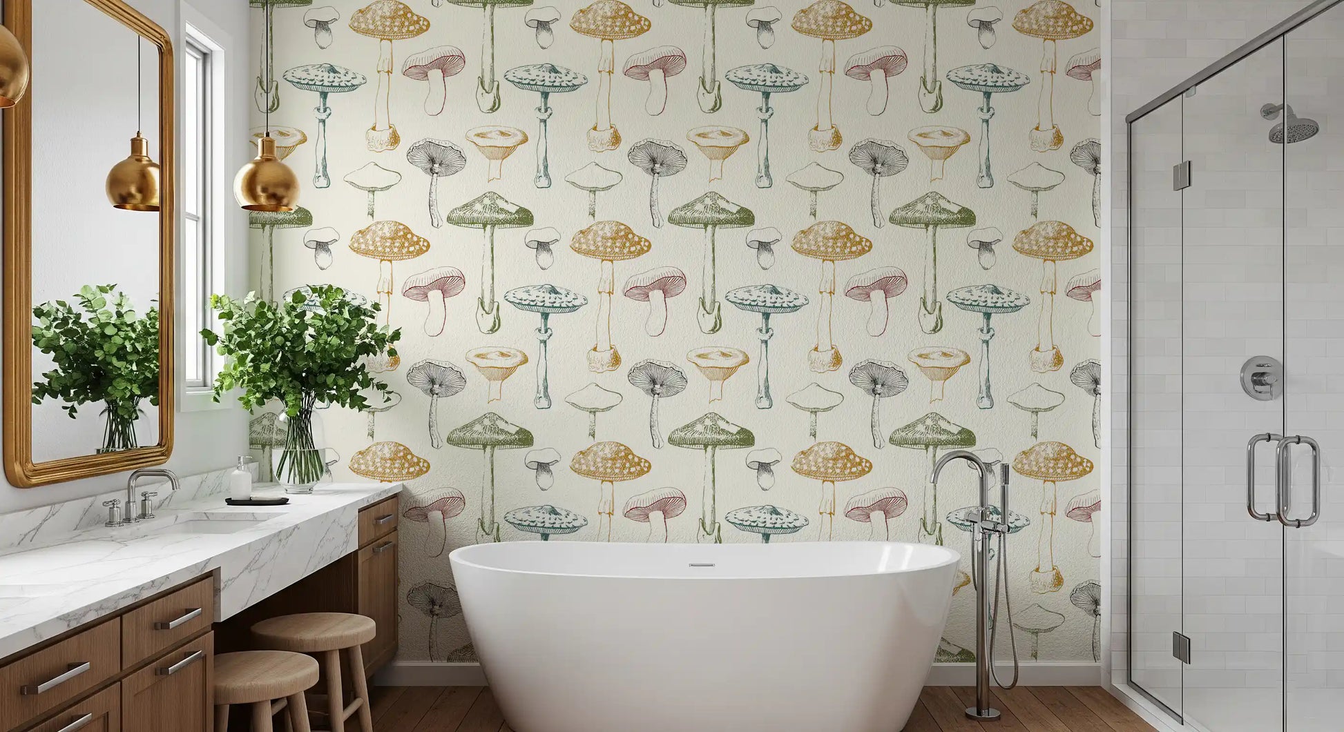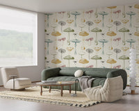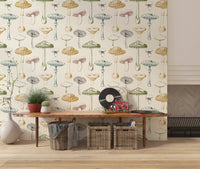 Transformeer je interieur met dit unieke botanische behang met paddenstoelen voor aan de muur. Met een betoverend patroon van handgetekende fungi brengt dit ontwerp rustieke charme en natuurlijke elegantie naar binnen. Elke paddenstoelenschets toont fijne details, uitgevoerd in een authentieke, vintage gravure stijl. Het kleurenpalet combineert gedempte olijfgroen, warm roestoranje, diep petrol en rustieke rode contouren tegen een zachte, crèmekleurige achtergrond. Accenten in houtskoolzwart zorgen voor diepte en definitie. Dit onderscheidende ontwerp verfraait keukens, eetkamers en gezellige woonruimtes, en creëert een uitnodigende, natuurlijke sfeer. Het past ook goed in een studeerkamer of hal, en voegt karakter en een vleugje bosbodem toe aan je huis.