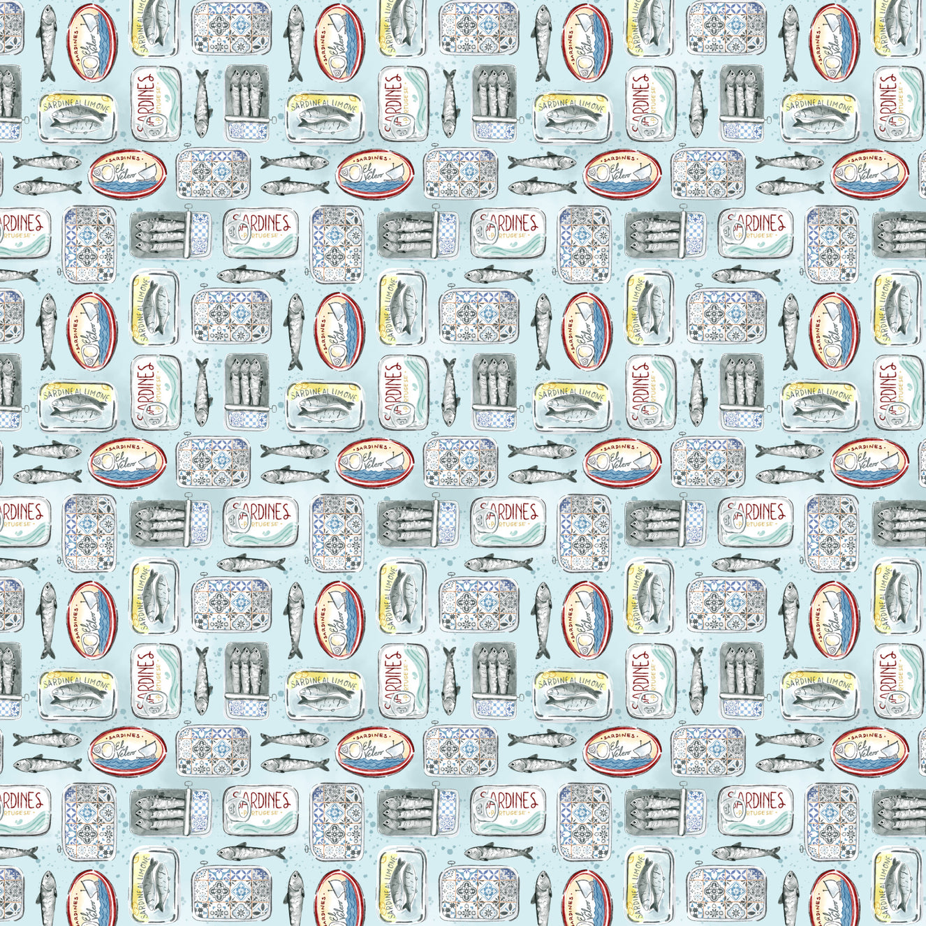 Een eigentijds zwart-wit nautisch patroon met handgetekende vissen, geïllustreerd in een heldere, gedetailleerde lijntekening. Het ontwerp combineert moderne minimalistische stijl met subtiele invloeden van wetenschappelijke illustraties, wat resulteert in een luchtige, evenwichtige herhaling.