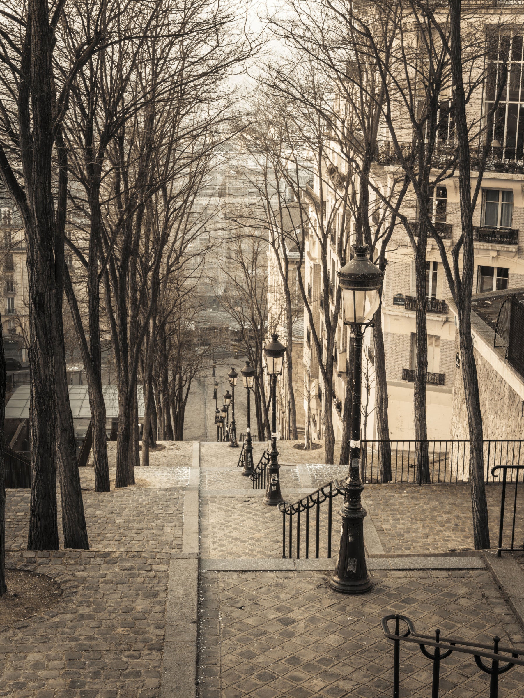 Montmartre Wallpaper Sepia city view down historic French stairs.