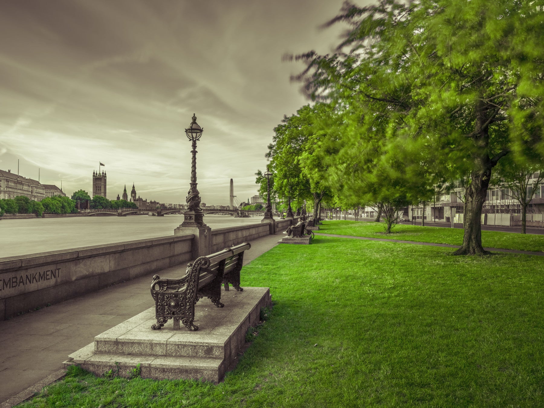 Escape to the tranquil banks of the Thames with this serene wallpaper. 'Restful Moments by the Thames' captures the timeless beauty of London's iconic riverfront, inviting you to pause and breathe. Imagine yourself sinking into one of the ornate benches that line the embankment, under the dappled shade of vibrant green trees. The Houses of Parliament and the London Eye provide a majestic backdrop against a soft, muted sky, creating a calming visual harmony. This image offers a sense of peace amidst the bustle of city life, a reminder to appreciate the simple beauty of nature and architecture intertwined. Let this scene transform your digital space into a haven of tranquility, offering a daily escape to a cherished moment of stillness by the Thames.