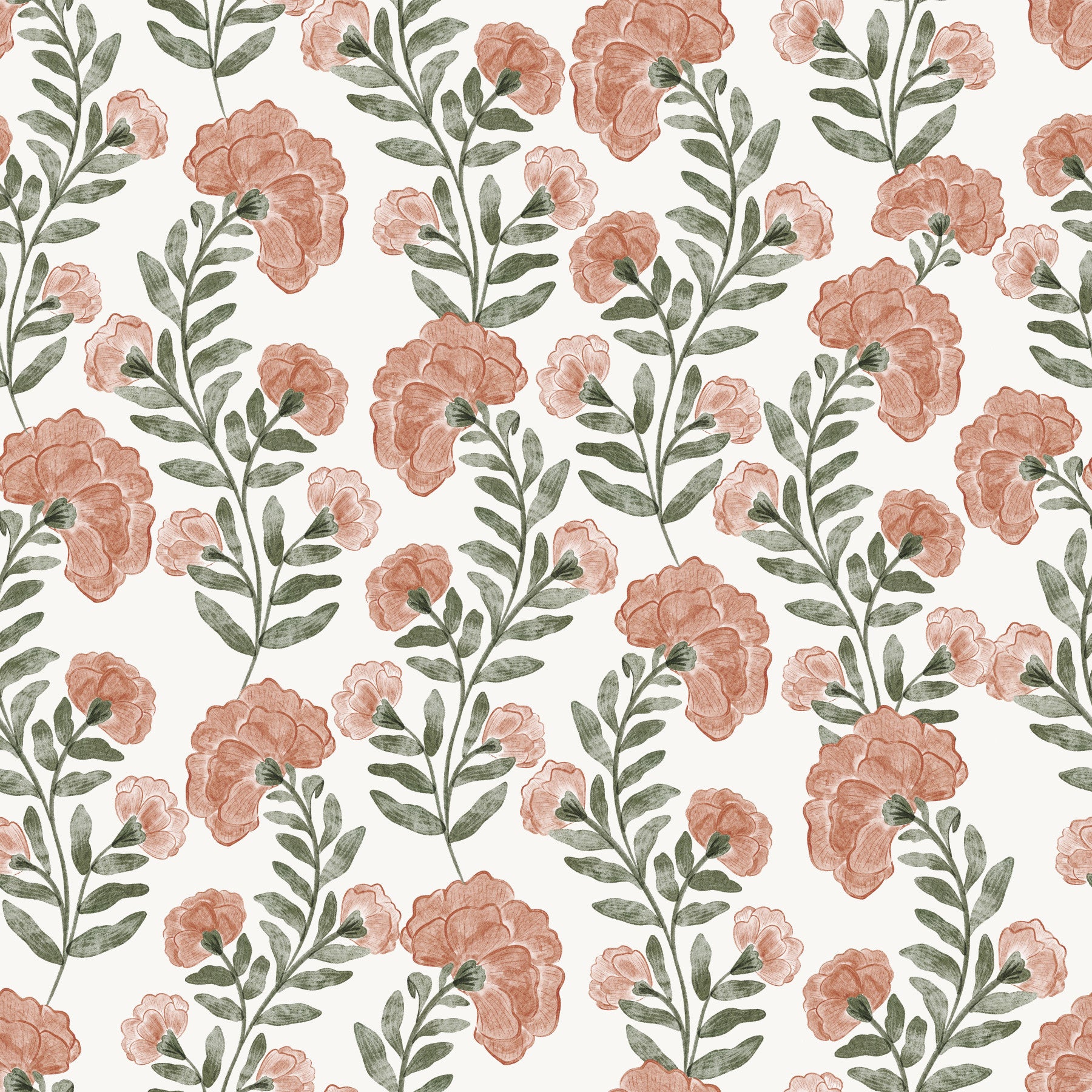 Omarm de allure van het verleden met dit boeiende bloemenbehang voor muren. Het naadloze patroon presenteert zachte blozende bloemen en gedempte groene bladeren, die een ontspannen, antieke charme oproept. Brushstroke-texturen creëren een artistiek, handgeschilderd gevoel. Ideaal voor slaapkamers of woonkamers combineert dit ontwerp goed met vintage meubels en creëert een kalmerende sfeer. Het verbetert ruimtes met verfijning en biedt een gastvrije achtergrond voor ontspanning.