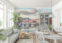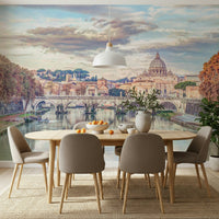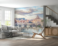 View of Basilica di San Pietro in Vatican, Rome, Italy. Capture the timeless grandeur of Rome with this breathtaking depiction of the Basilica di San Pietro. This image transports you to the heart of Vatican City, showcasing the iconic dome rising majestically above the Roman skyline. A historic bridge gracefully spans the tranquil waters, its arches reflecting the soft, ethereal light of the sky. The scene is bathed in a warm, muted palette, lending an air of serenity and reverence to the surroundings. The composition expertly balances the architectural marvels with the natural beauty of the landscape, creating a visual masterpiece that evokes a sense of history, art, and spiritual significance. Elevate your living space with this stunning tribute to one of the world's most iconic landmarks, adding a touch of Roman elegance and timeless beauty to your walls.