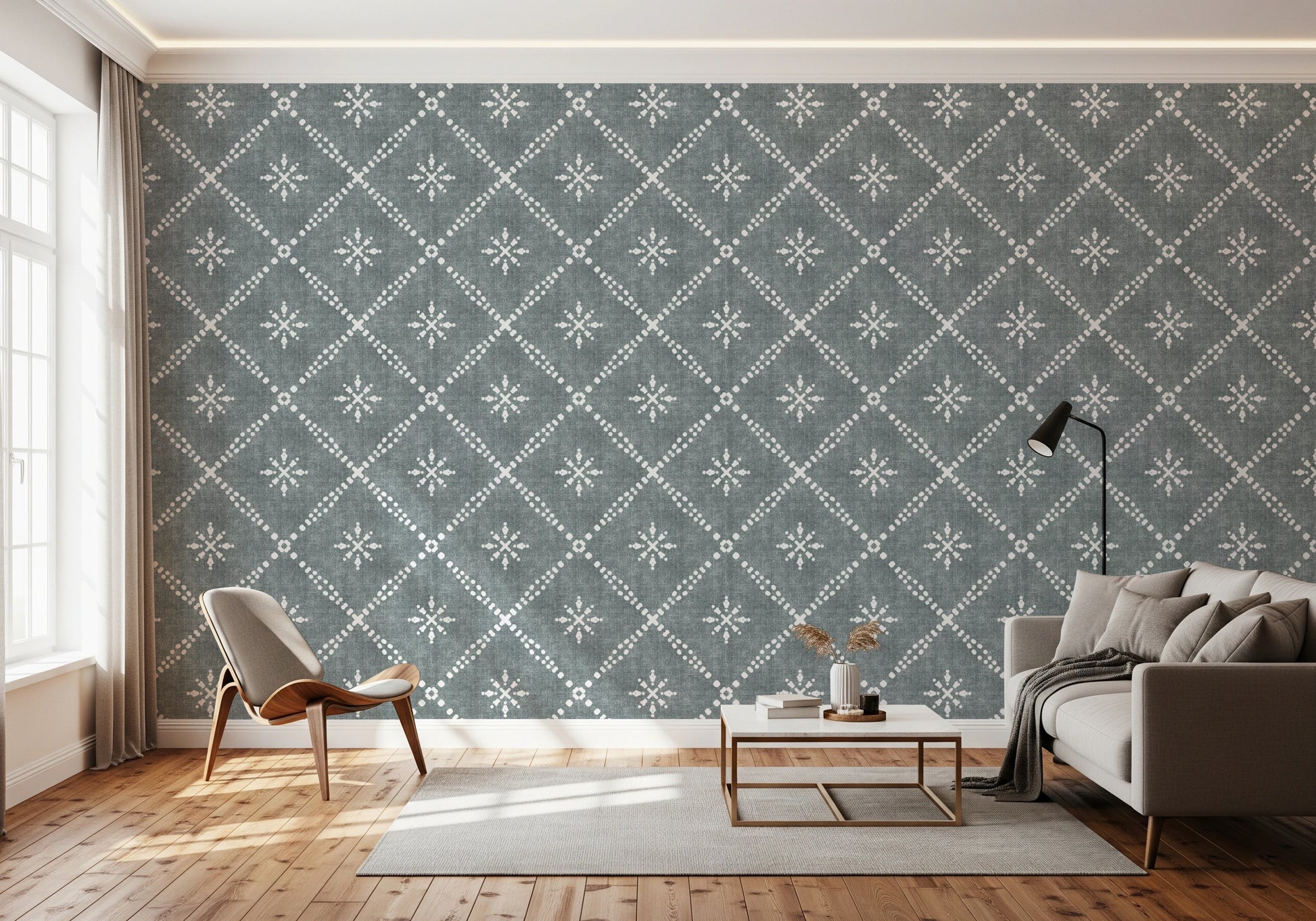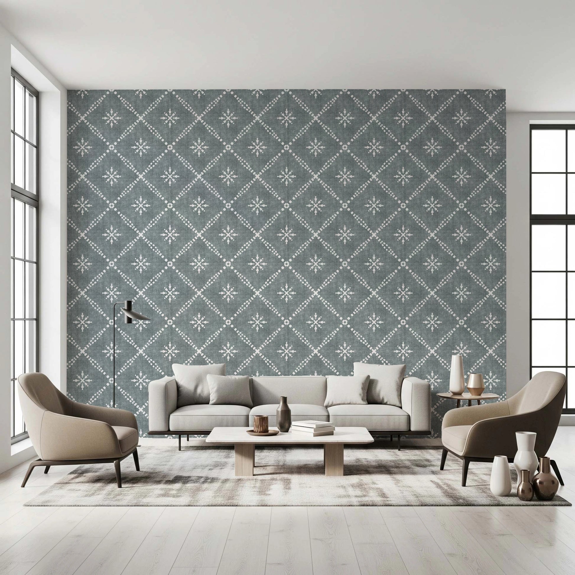 Poczuj spokój dzięki „Boho Dotted Lattice Grunge Calming Blue”, dekoracji ściennej emanującej pogodną elegancją. Wzór ten przedstawia kratownicową ramę z kropkami przeplataną stylizowanymi motywami kwiatowymi, utrzymaną w kojącym, niebieskim odcieniu z subtelnie postarzaną, grunge'ową fakturą. Połączenie geometrycznej struktury i swobodnych motywów kwiatowych tworzy urzekającą estetykę boho, idealną do nadania wnętrzom spokoju i wizualnego uroku. Idealny do stworzenia relaksującej i przytulnej atmosfery, ten wzór wnosi odrobinę artystycznego uroku do każdego pomieszczenia, pięknie komponując się z różnymi stylami wnętrzarskimi, od nowoczesnego minimalizmu po eklektyczny styl boho.