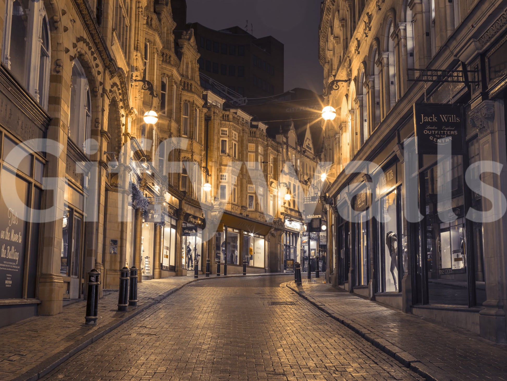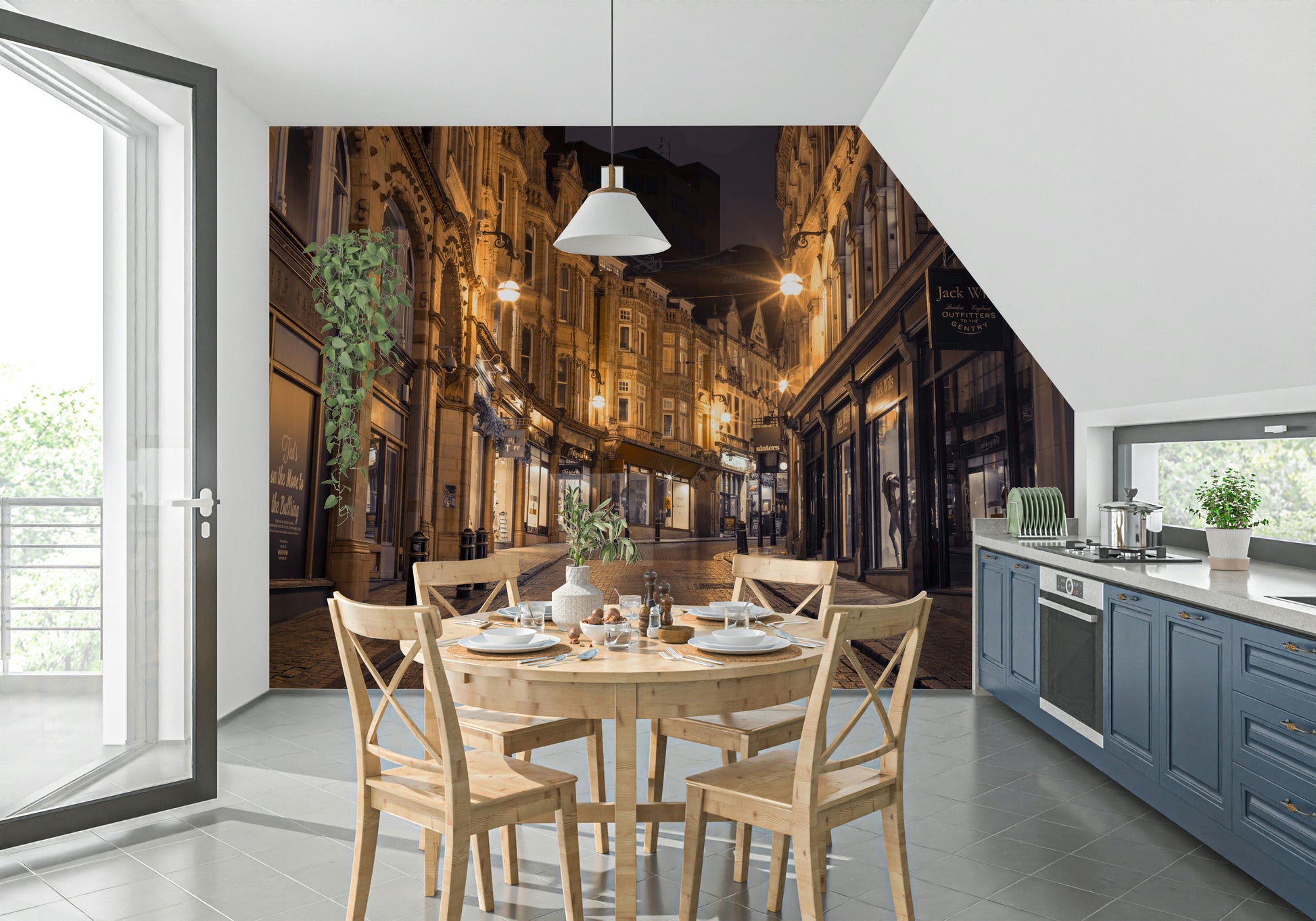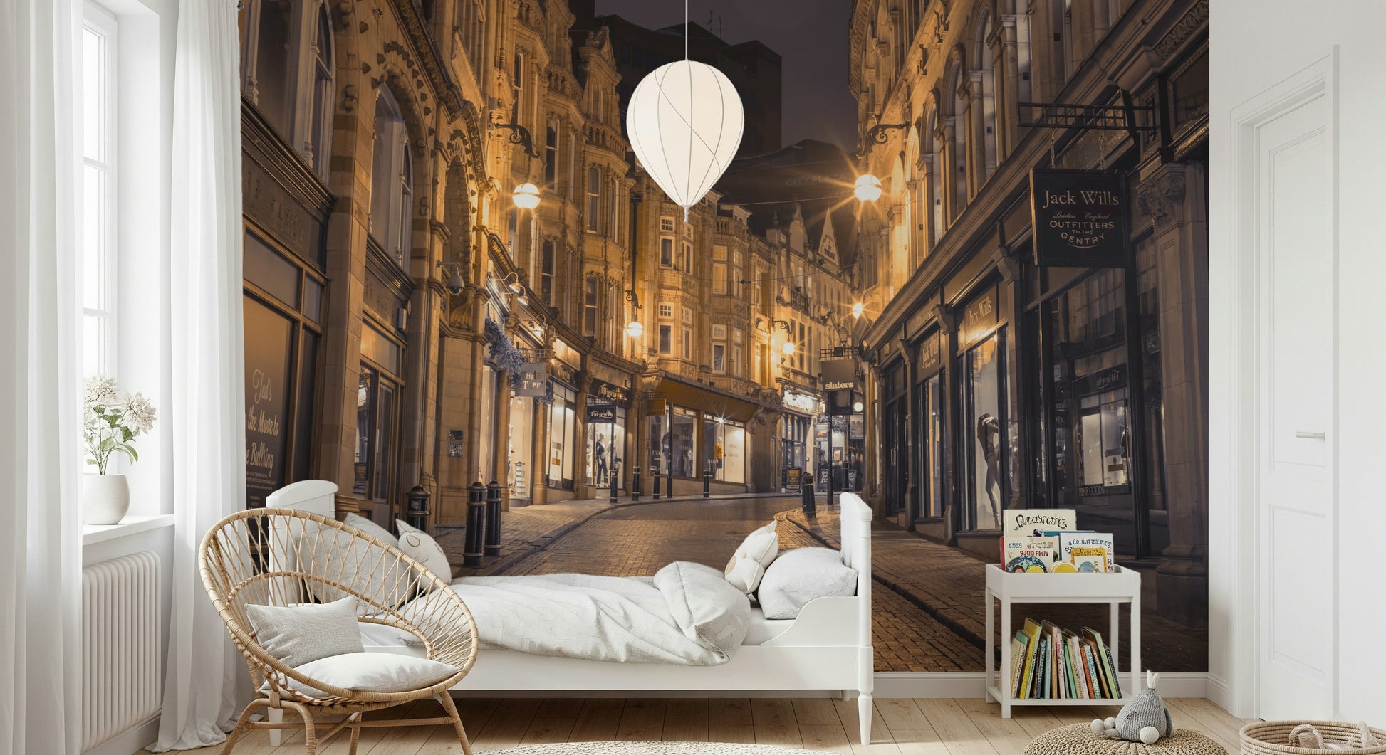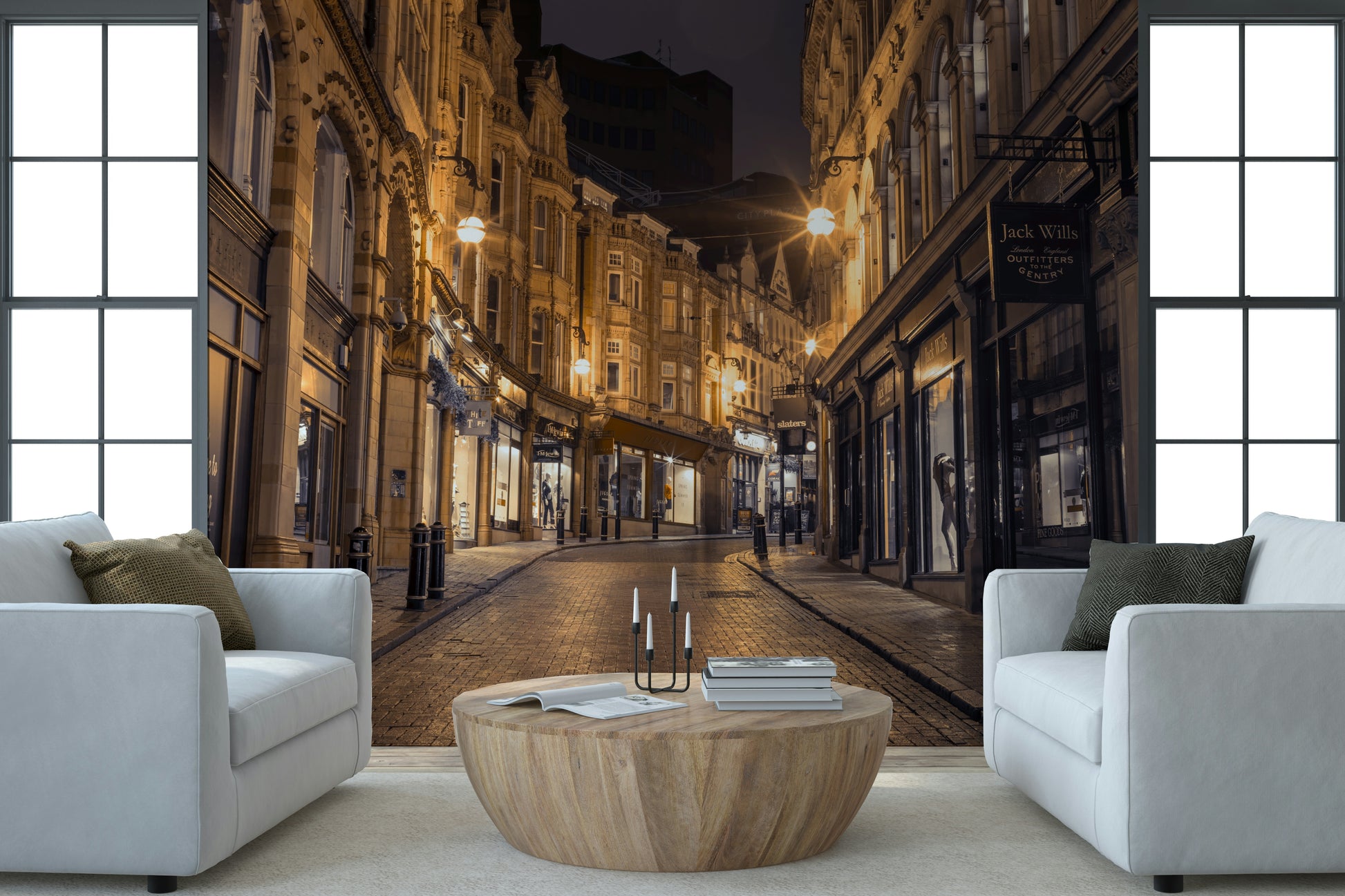 View of Cannon street at night, Birmingham, UK. Bring the charm of a bygone era into your home with this captivating wallpaper for walls. It depicts a historic cobblestone street illuminated by warm streetlights. The design showcases architectural details and inviting shopfronts, perfect for creating an ambiance of timeless elegance. The muted, earthy tones lend themselves well to hallways, living rooms, or even a home office, creating a sense of depth and character. Transform your interior into a captivating scene of urban beauty with this stunning wall décor.