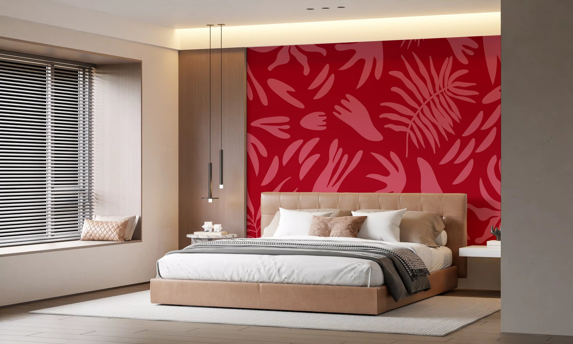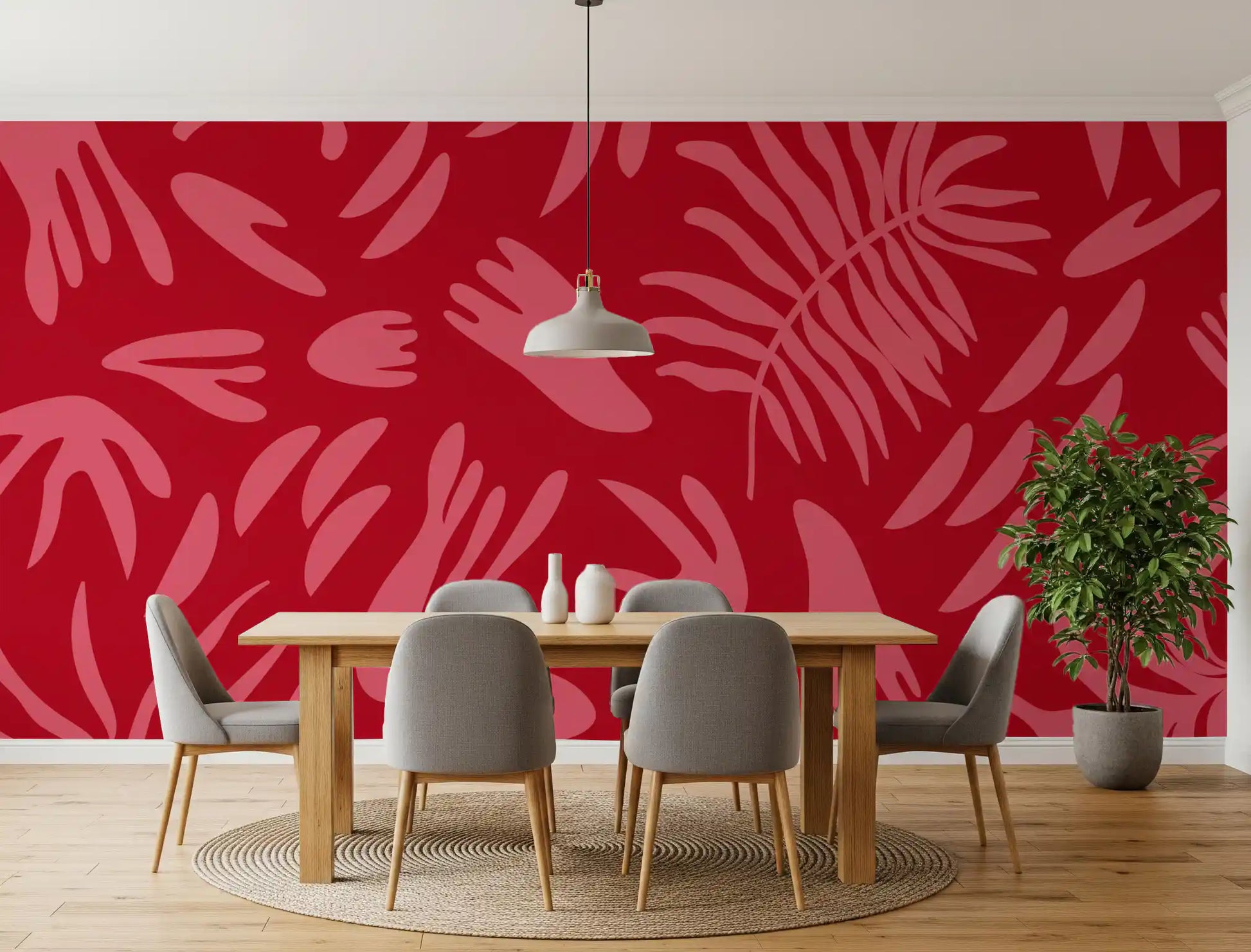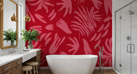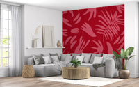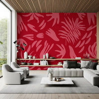 Ta żywa tapeta ścienna wnosi energetyczny akcent do każdego wnętrza. Wyraziste, stylizowane botaniczne kształty w delikatnym, różowym odcieniu tańczą na bogatym, karmazynowym tle, tworząc urzekający, wizualny rytm. Wzór charakteryzuje się abstrakcyjnymi liśćmi i zabawnymi, organicznymi formami, przywołując nowoczesną estetykę retro, nawiązującą do sztuki połowy XX wieku. Ten wyrazisty wzór doskonale sprawdzi się jako ściana akcentowa w nowoczesnym salonie, ożywi jadalnię lub nada sypialni szykownego, artystycznego charakteru. Kontrastowa paleta barw głębokiej czerwieni i jasnego różu tworzy wyrafinowaną, a zarazem radosną atmosferę, podkreślając nowoczesny i eklektyczny wystrój dzięki swojemu niepowtarzalnemu designowi. Idealnie komponuje się z różnymi stylami wnętrz, oferując świeże spojrzenie na botaniczne wzory.