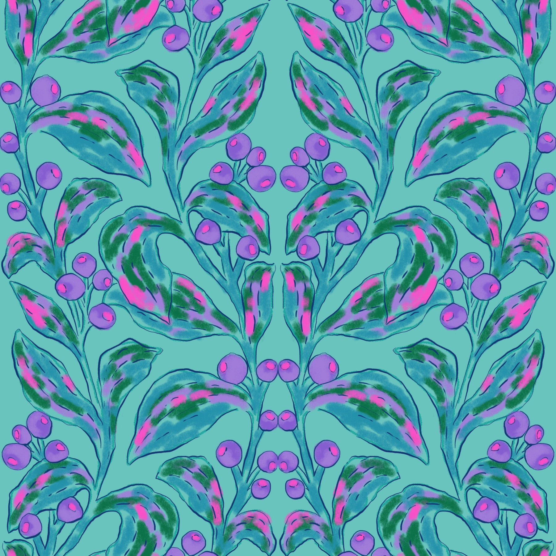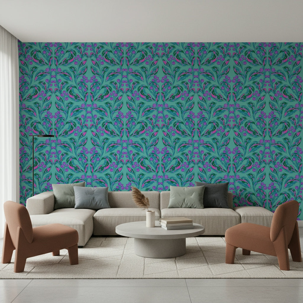 Transform any room with this stylized botanical design. Leaves, berries, and brushstrokes combine in a symmetrical pattern that feels both modern and timeless. The palette of teal, pink, purple, and green brings a refreshing touch to walls, brightening any space. This wallpaper for walls provides a lively backdrop for living rooms, bedrooms, hallways, or even a creative home office. The vibrant colors complement natural light, making rooms feel more open and inviting. It’s a simple way to give your space a unique identity with a dash of sophisticated charm and visual appeal. Add character and create an inviting interior with this eye-catching design.