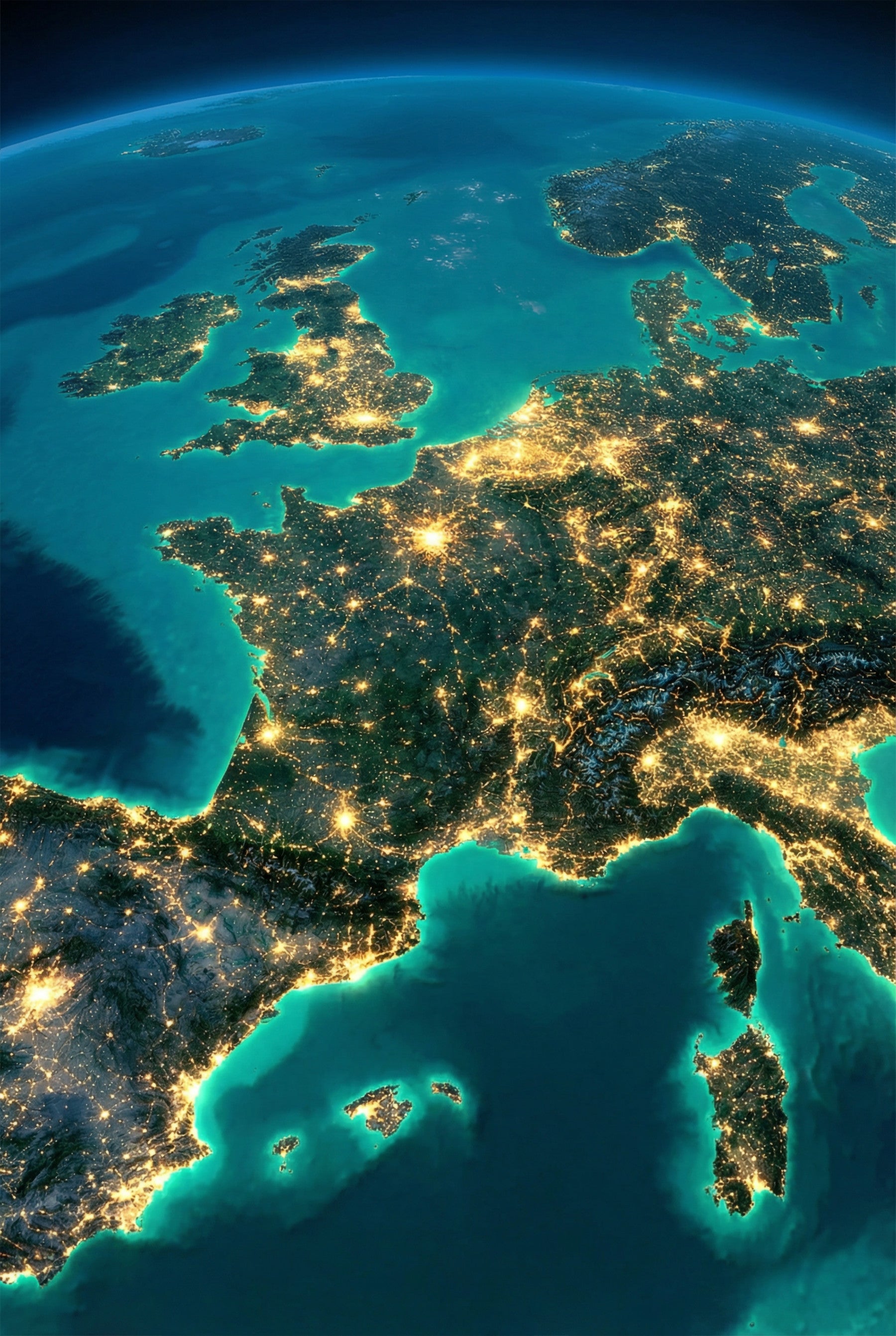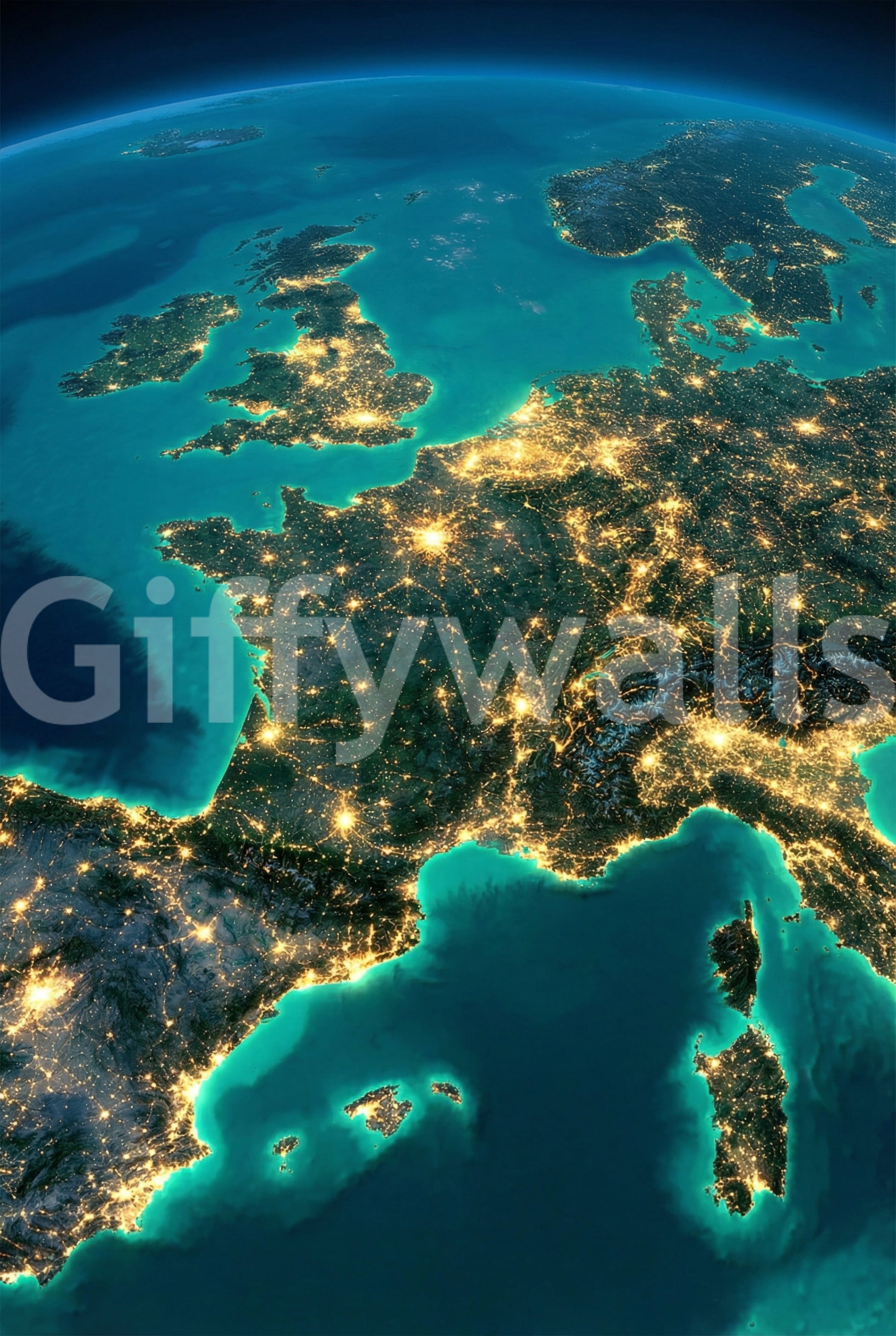Wnieś piękno Europy do swojego domu dzięki tej zachwycającej tapecie ściennej „Europa nocą”. Ten wzór przedstawia widok kontynentu z lotu ptaka, oświetlonego światłami miasta na tle ciemnej przestrzeni. Turkusowe wody otaczają lądy, tworząc uderzający kontrast z rozświetlonymi centrami miast. Idealna do gabinetu, salonu lub biura, ta tapeta doda głębi i intrygi każdej przestrzeni. Przekształć swoje ściany w urzekający pokaz geografii i nocnych cudów. Niech ten wzór zainspiruje do rozmowy i zainspiruje żądzę wędrówek.