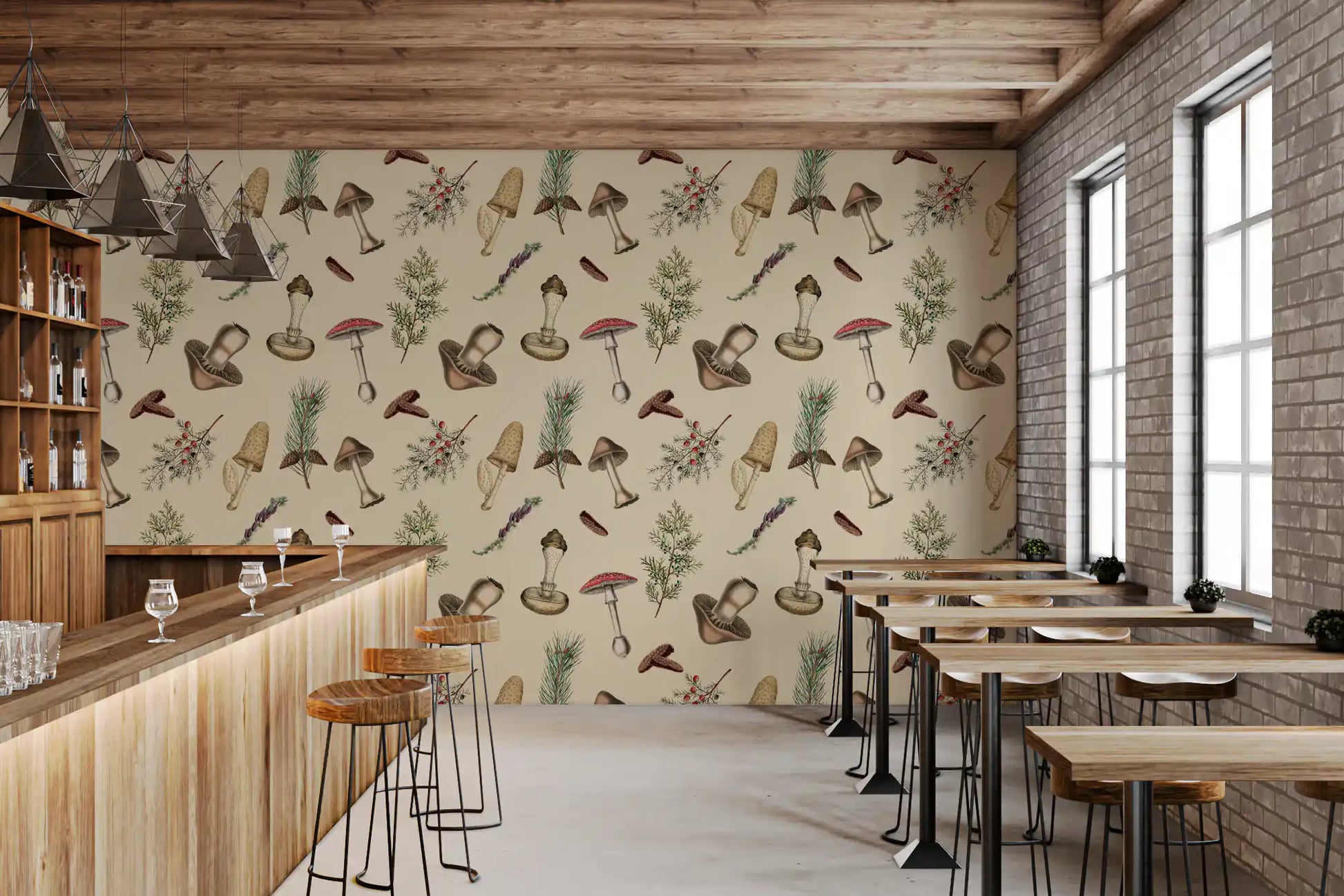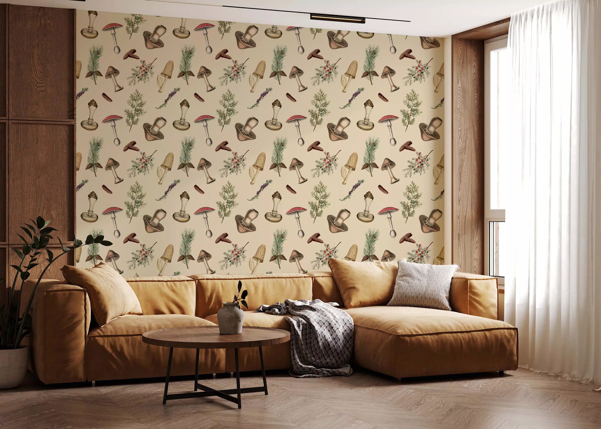 Odkryj spokojne piękno natury dzięki tej wyjątkowej tapecie na ściany. Ten wzór prezentuje urzekający zestaw vintage’owych ilustracji botanicznych, przedstawiających różnorodne grzyby, bujne gałązki sosny z szyszkami oraz żywe gałązki jałowca ozdobione czerwonymi jagodami. Misternie wykonane detale każdego elementu tworzą naturalistyczny i wyrafinowany wzór. Ciepłe beżowe tło doskonale komponuje się z bogatą zielenią, ziemistymi brązami i subtelnymi czerwonymi akcentami, tworząc harmonijną i przyjazną paletę kolorów. Ten elegancki wzór odmienia każde wnętrze, wprowadzając do niego spokój lasu. Zamontuj ten unikalny wzór w kuchni, jadalni, domowym biurze lub salonie. Tworzy urokliwą, rustykalną atmosferę i wzbogaca tradycyjne lub nowoczesne przestrzenie o ponadczasową botaniczną elegancję.