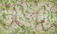 Bring the wild indoors! This design features playful monkeys among lush tropical foliage and hummingbirds. The palette of earthy greens and browns on a beige background creates a calming, natural ambiance. Perfect for nurseries, bedrooms, or living rooms, this wallpaper for walls complements bohemian, tropical, and eclectic interiors. Transform your space into a vibrant oasis with this enchanting design. This wallpaper design brings a touch of adventure to any room.