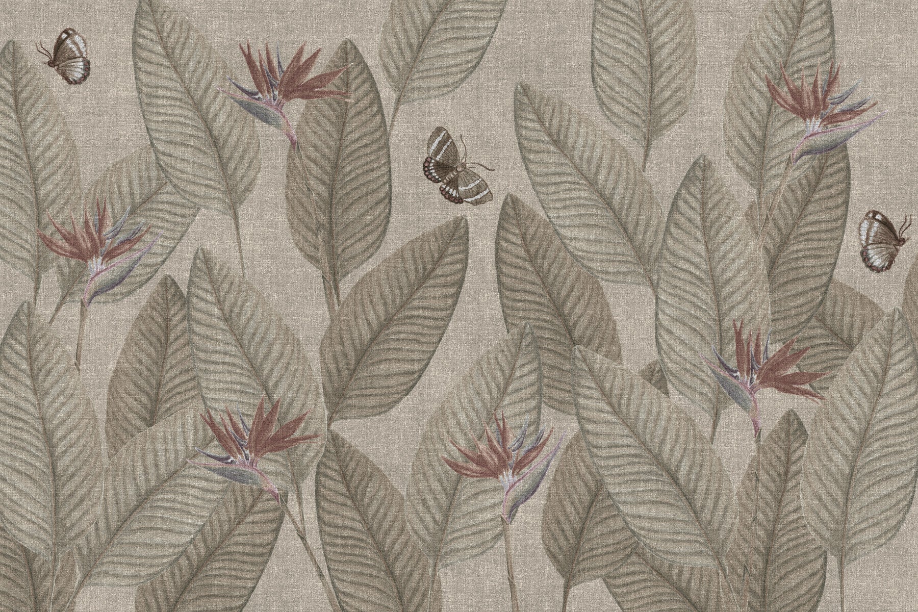 Jungle Life Muted product: Calming taupe mural wallpaper of tropical flora and fauna.