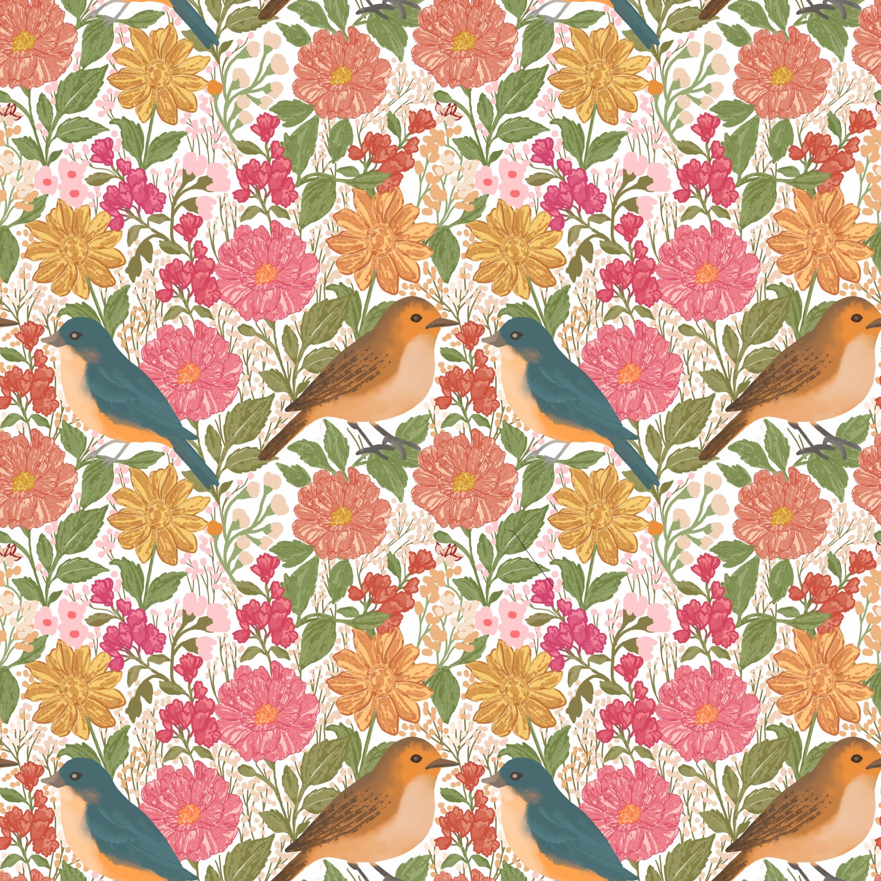 Adorn your walls with this whimsical floral display. This wallpaper for walls presents cute birds nestled amongst a field of detailed flowers. The artistic style utilizes a soft color palette. This includes pinks, yellows, and greens, all set against a clean white backdrop. Ideal for adding a touch of cheer to your living room, bedroom, or nursery. Its bright yet calming presence works well with various interior design themes, delivering a cozy and inviting feel to any space.