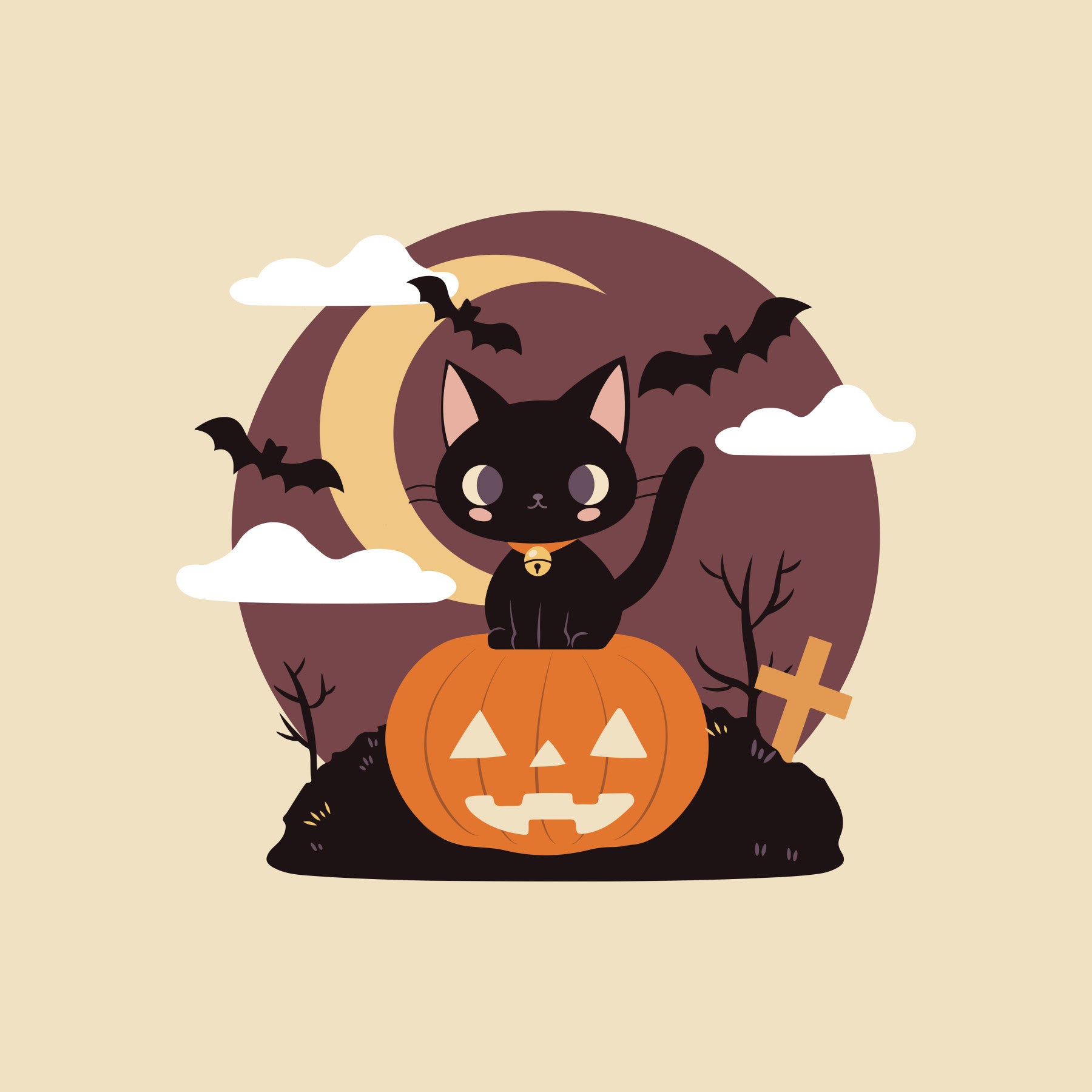 Embrace the Halloween spirit with this charming black cat halloween wallpaper! This delightful design makes for a perfect halloween wall mural, featuring an adorable black cat perched atop a grinning jack-o'-lantern, ready to cast a spell of festive cheer. The scene is set against a backdrop of a whimsical moon and spooky silhouettes of bats in the night sky. A graveyard hill with a cross and barren trees add to the Halloween spooky atmosphere. The overall aesthetic of this spooky cat wallpaper is playfully spooky and irresistibly cute, making it perfect for adding a touch of seasonal whimsy to your home. This piece of pumpkin wall decor will instantly infuse your space with Halloween magic and brighten your day with the endearing charm of a black cat and a grinning pumpkin.