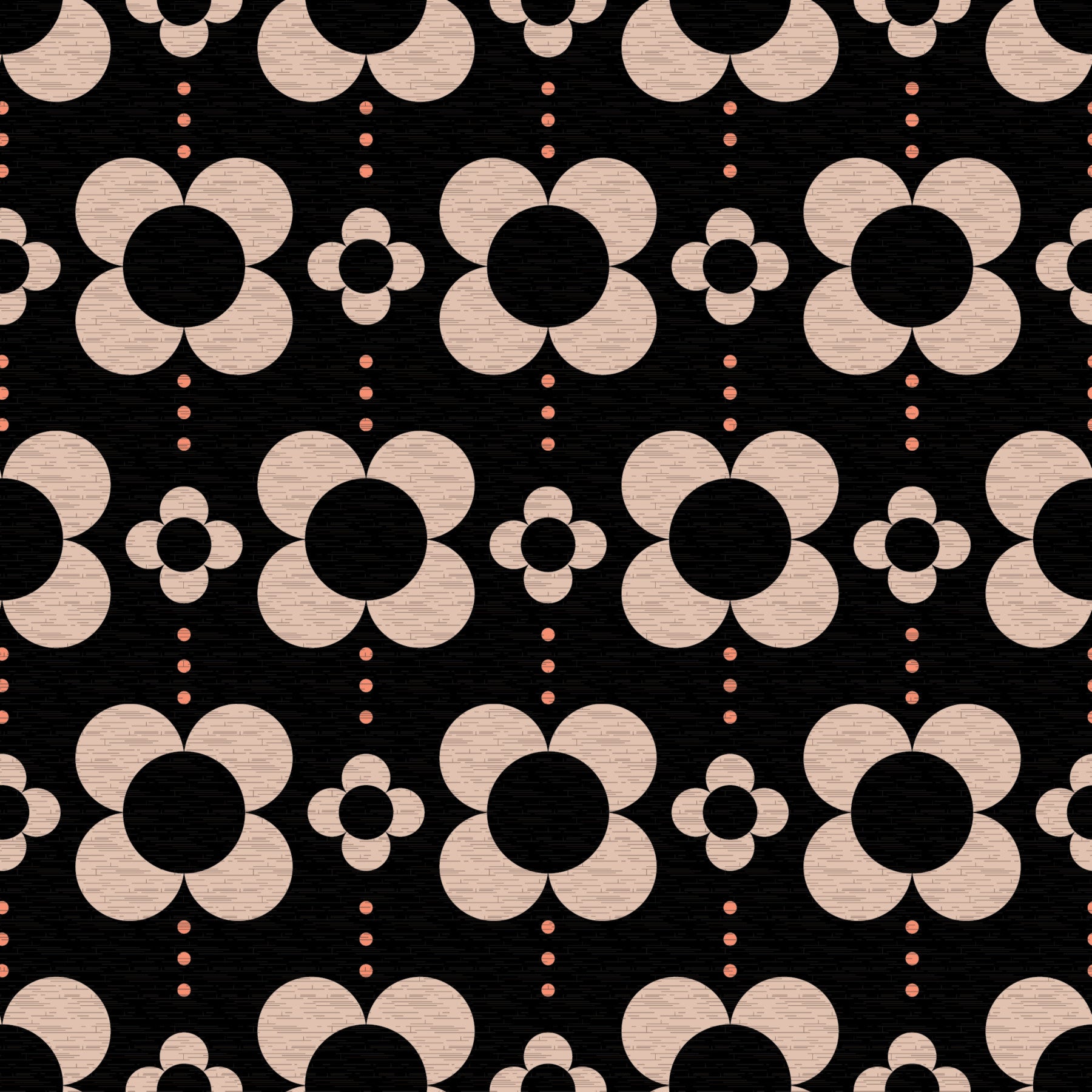 60s Charm brings a bold dose of mid-century charm with oversized stylized daisies arranged in a rhythmic repeat. The contrast of soft beige petals against a deep black background creates a striking yet cozy visual balance. Subtle dotted lines between blooms add a playful movement that feels timeless and chic — ideal for elegant interiors with mid-century vibe.