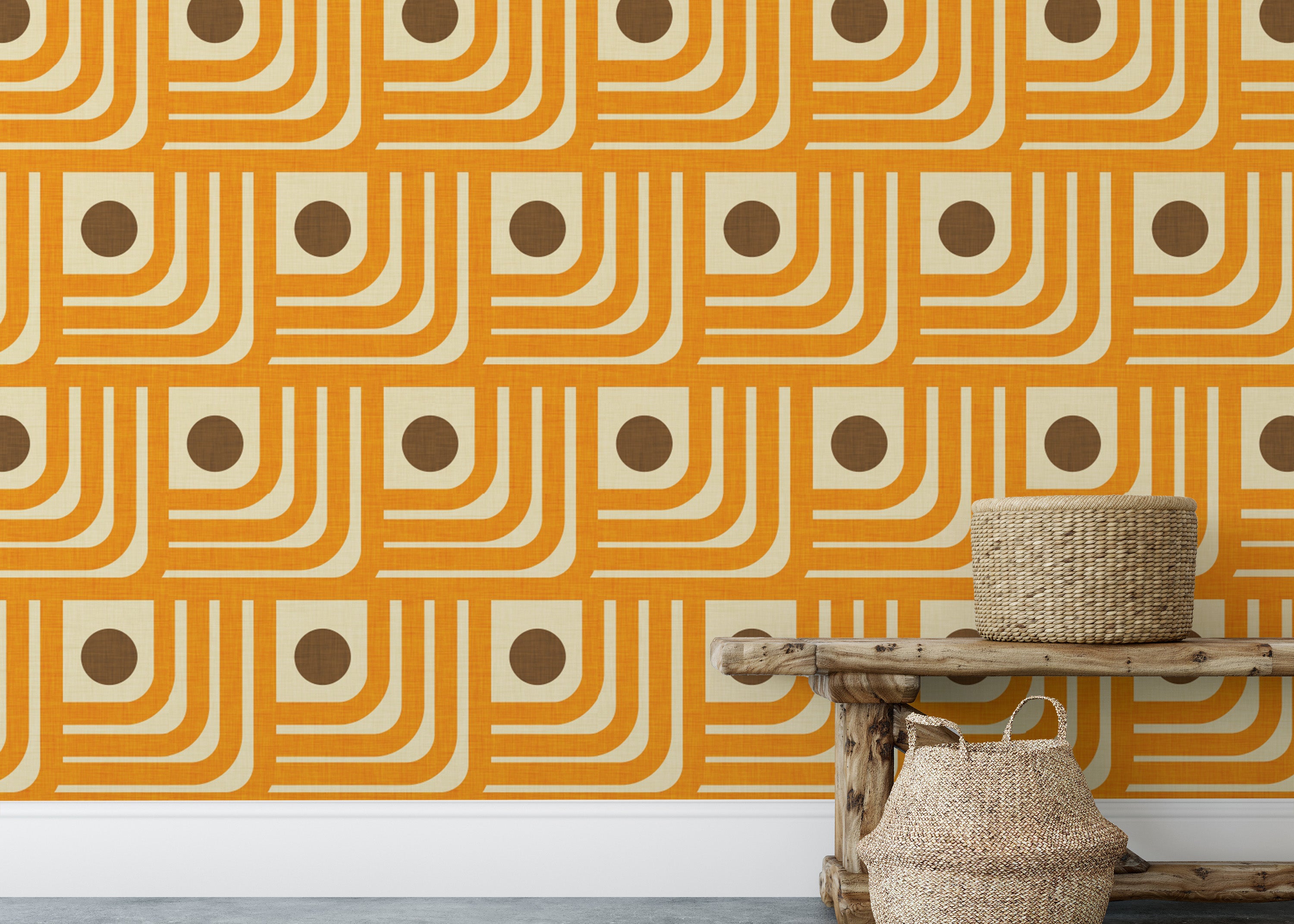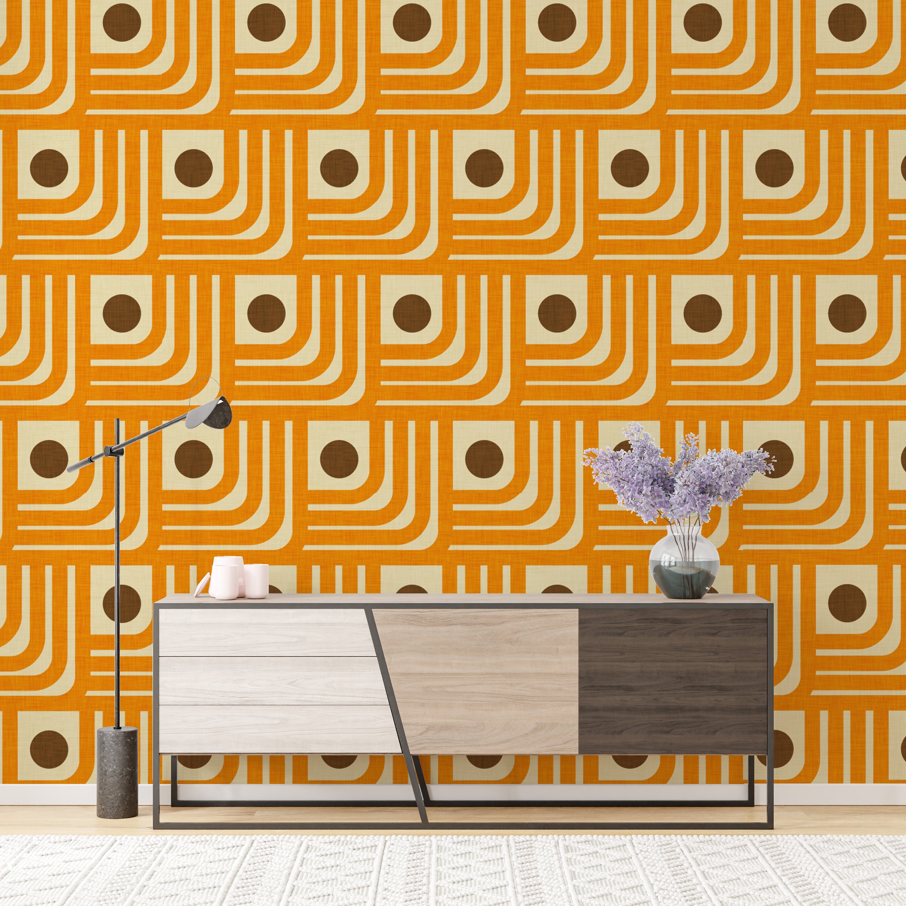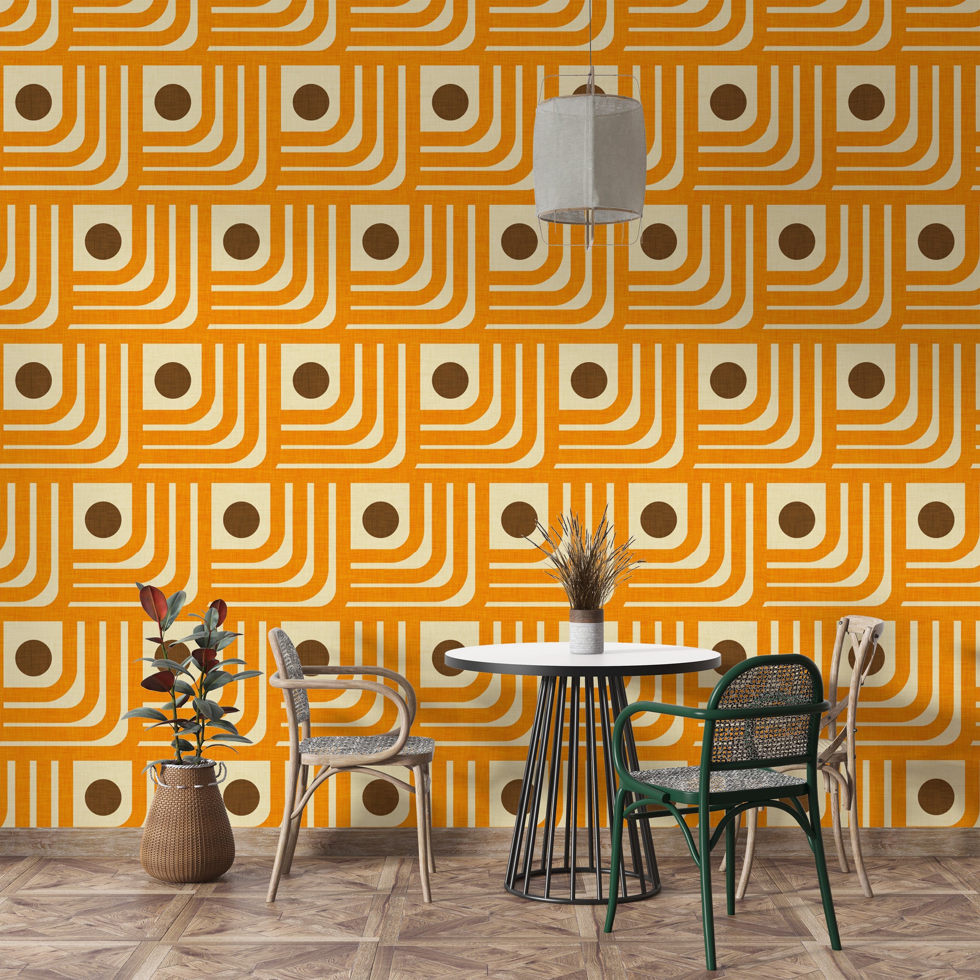 Vintage-inspired 70s orange geometric wallpaper