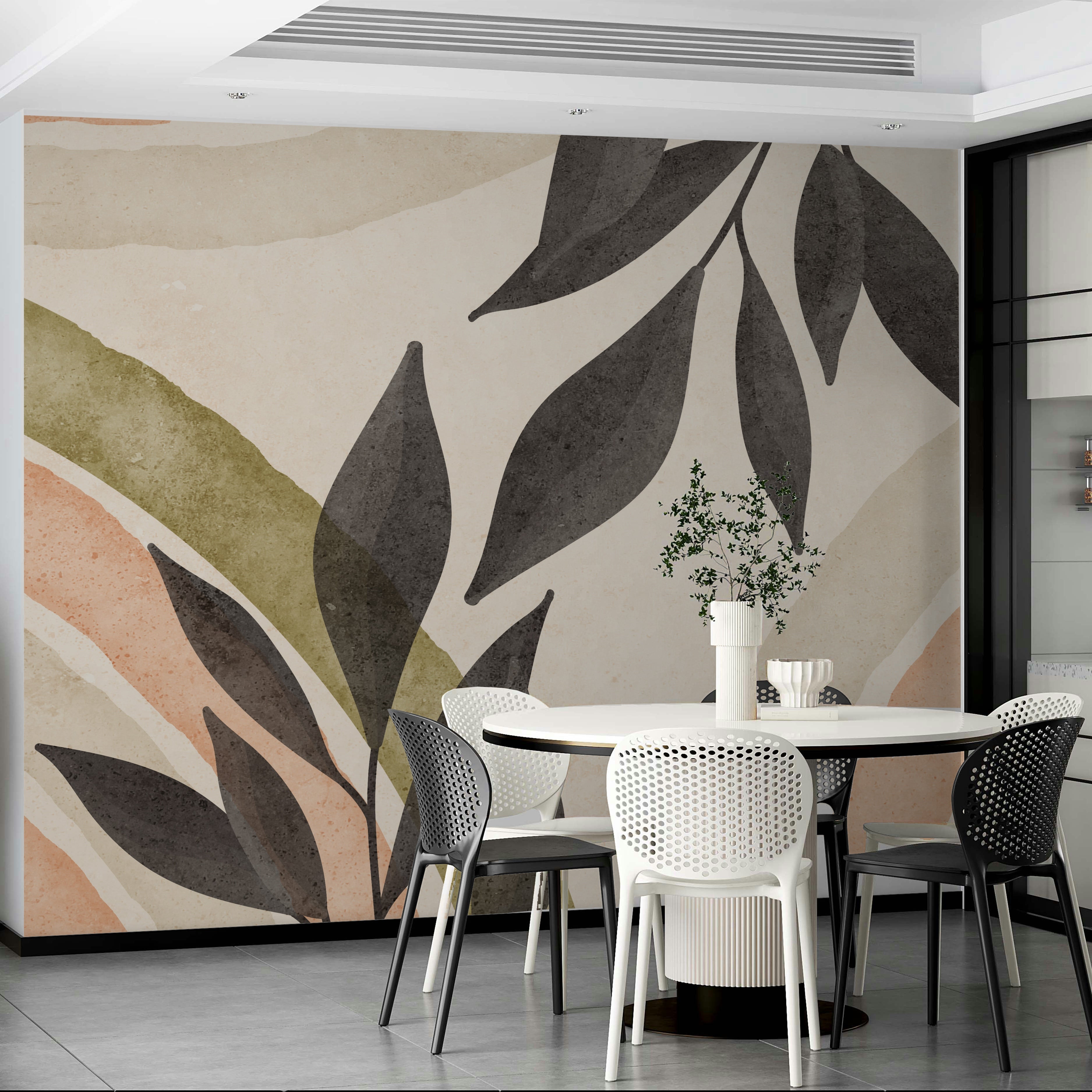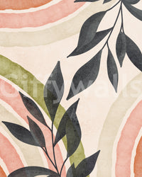 This abstract wallpaper showcases a captivating interplay of organic and geometric forms. Delicate watercolor washes in calming peach, cream, and olive green hues form a gentle, undulating base. Dark grey stylized leaves and branches add a layer of texture and depth, creating a balanced visual harmony. The muted color scheme creates a sense of peace and serenity, while the interplay of shapes keeps the design interesting and engaging. Ideal for creating a sophisticated yet relaxing atmosphere in any room.