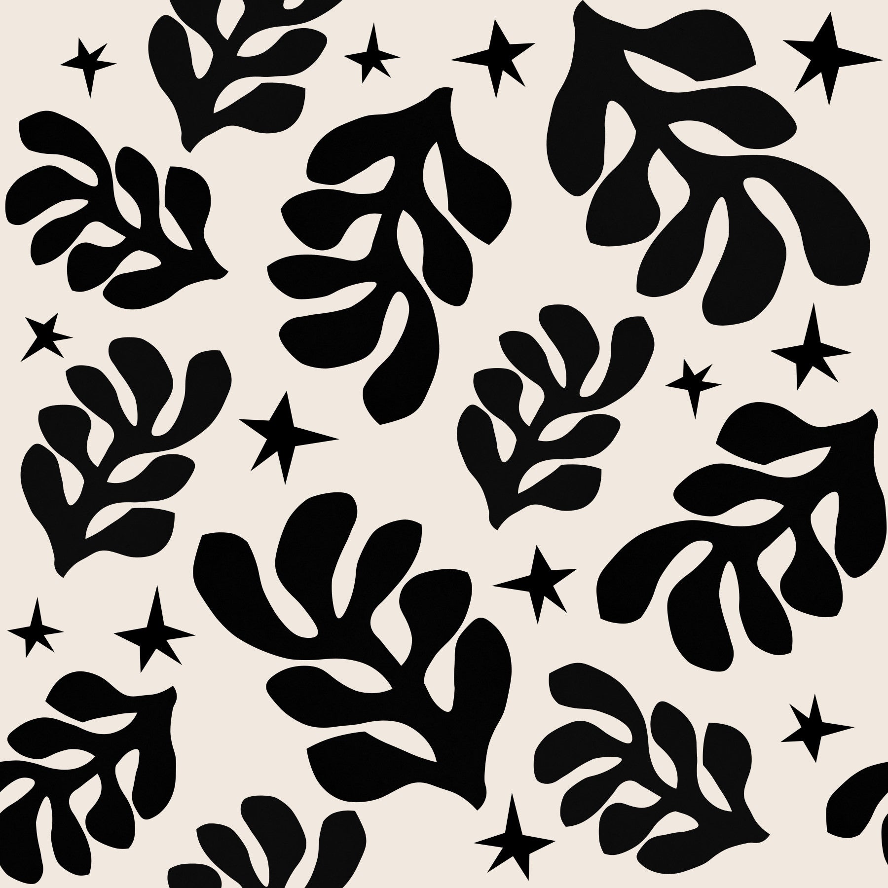 Transform any room with this stylish pattern. The design features bold, abstract foliage and stars in contrasting black on a soft beige backdrop. This striking combination makes a statement. It is perfect for living rooms, bedrooms, or hallways and is suitable for creating a feature wall. This wallpaper for walls introduces a modern, art-deco touch, enhancing the interior's elegance and visual appeal. The design is seamless and repetitive, providing a smooth, sophisticated look throughout any space.