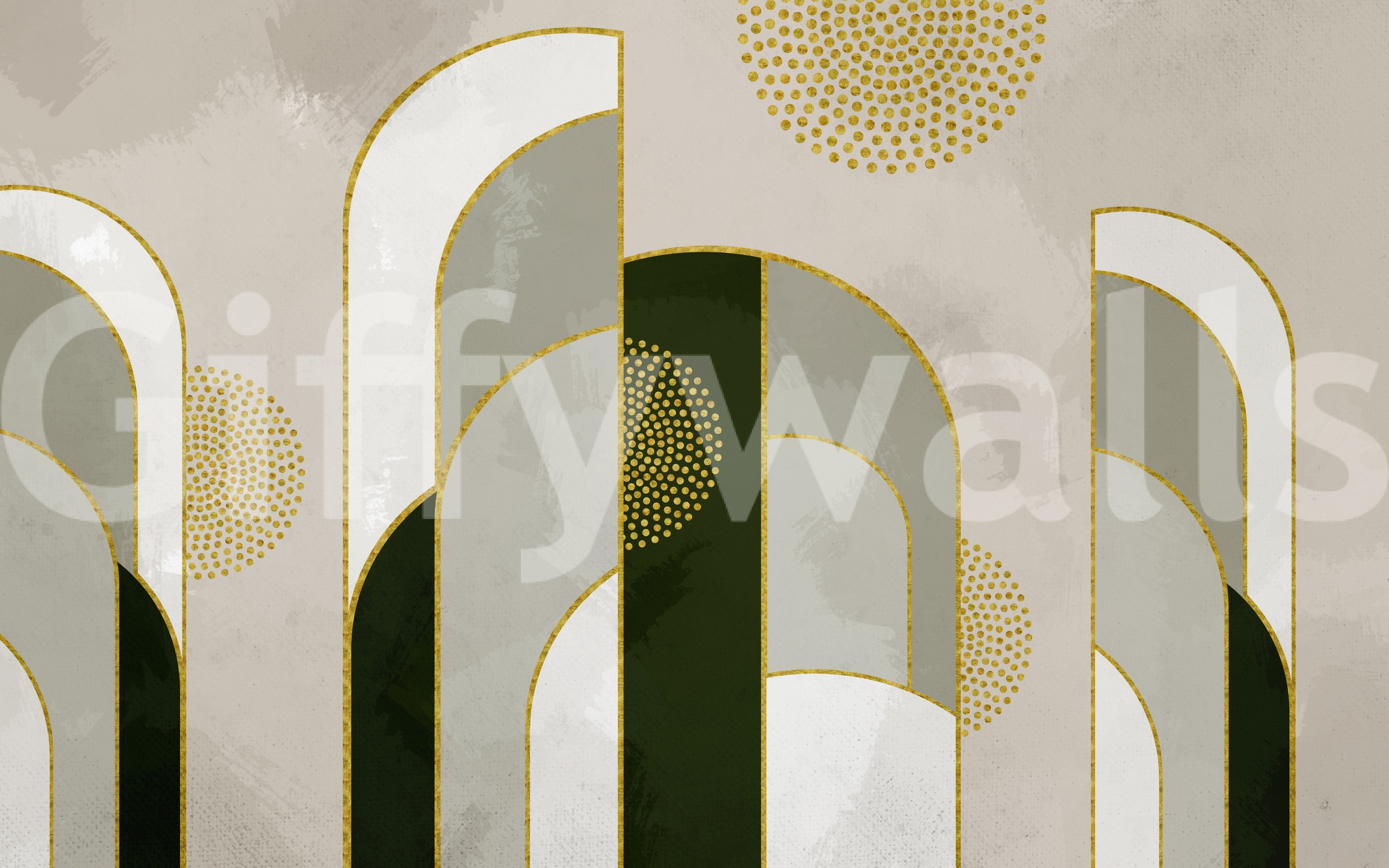 This wallpaper is a modern masterpiece, combining the elegance of gold with the calmness of deep green. The abstract design features a series of arched shapes and dotted patterns, creating a unique and visually interesting piece. The muted beige and grey tones provide a neutral base, allowing the gold and green to stand out. The design is sophisticated and understated, making it perfect for a variety of settings. This wallpaper brings a contemporary feel to any room, adding a touch of luxury without being overwhelming. It's a versatile choice for bedrooms, living rooms, or even home offices, creating a modern and sophisticated ambiance.