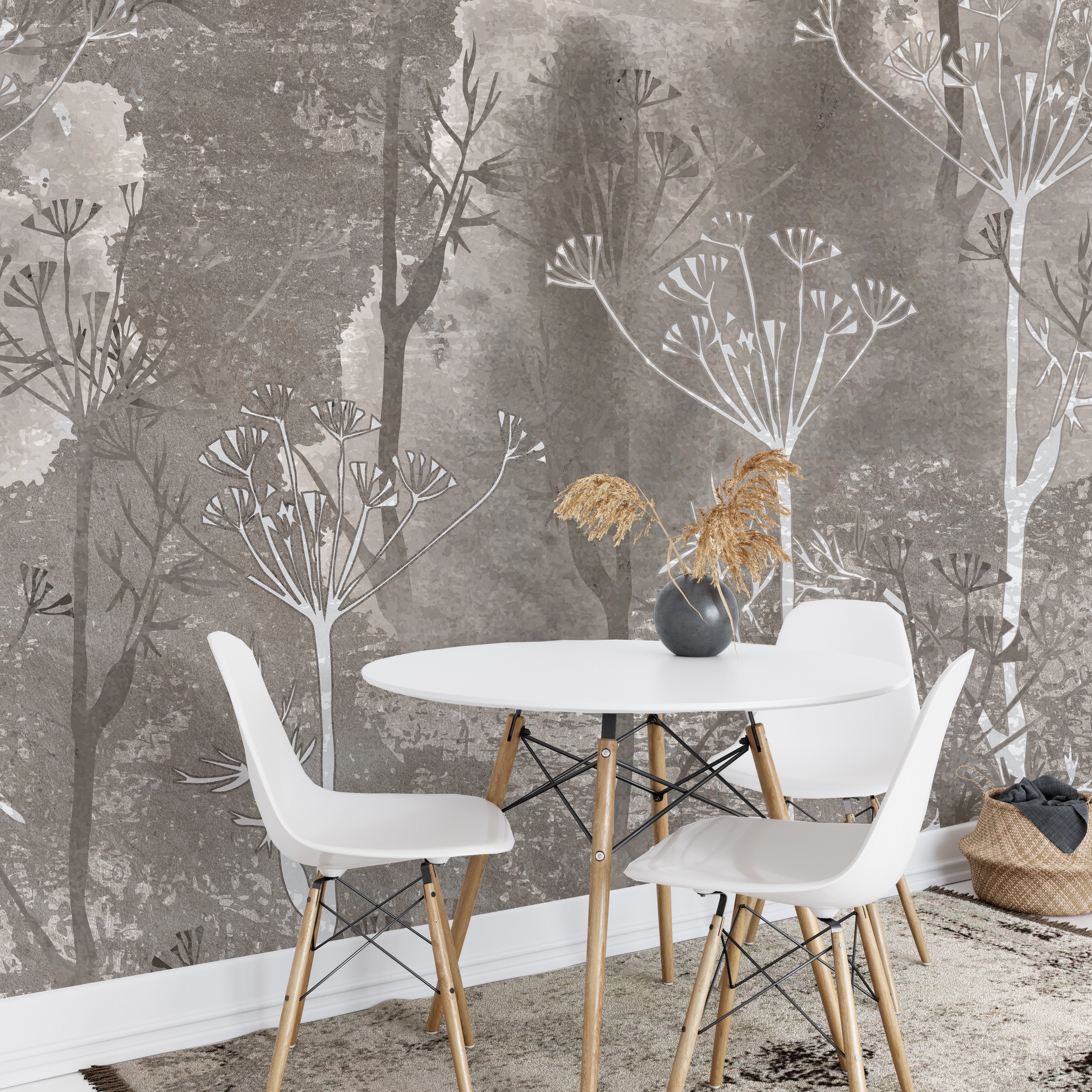 This unique design brings a sophisticated flair to any room, featuring an elegant blend of warm grey and white tones. The conceptual tree pattern adds an artistic touch, creating an illusion of depth that enhances your room's spatial perception. Ideal for bedrooms, this wallpaper serves as a stunning backdrop, especially behind a bed. It also seamlessly integrates into patio designs, adding a touch of modern elegance. Pair it with sleek Nordic furniture to achieve a harmonious and stylish look. This sepia-gray abstract wallpaper is a superb choice for anyone seeking to add a touch of sophistication and warmth to their home.