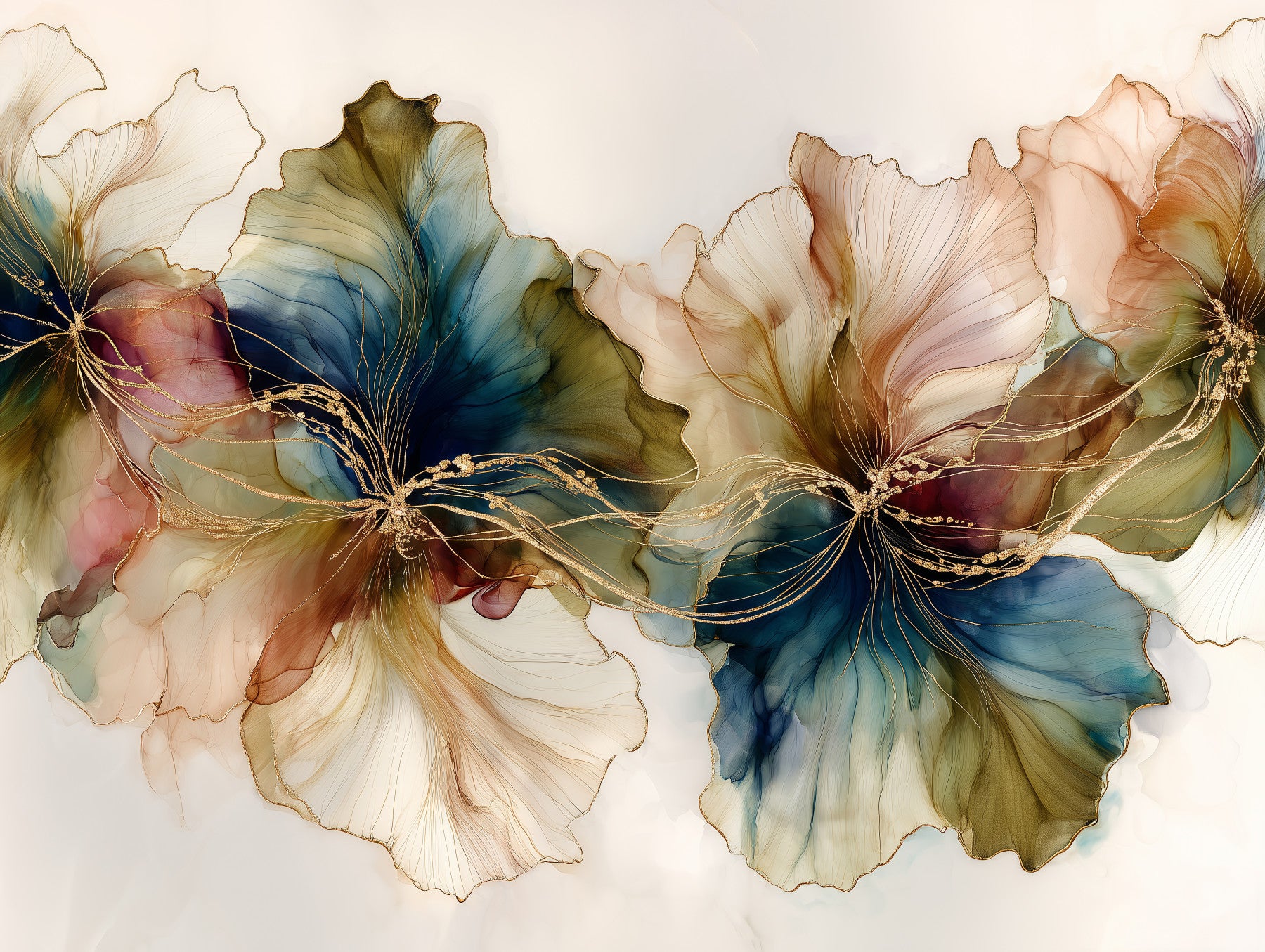 Capture the sophistication of abstract florals with this exquisite wallpaper for walls. The delicate ink wash effect blends soft greens, blues, and blush tones with a touch of gold shimmer. It's a versatile design that brings a sense of calm and elegance to any space. Perfect for living rooms, bedrooms, or dining rooms, this wallpaper elevates interiors with its graceful, artistic presence and subtle beauty. The flowing lines and sheer layers create depth and visual interest.