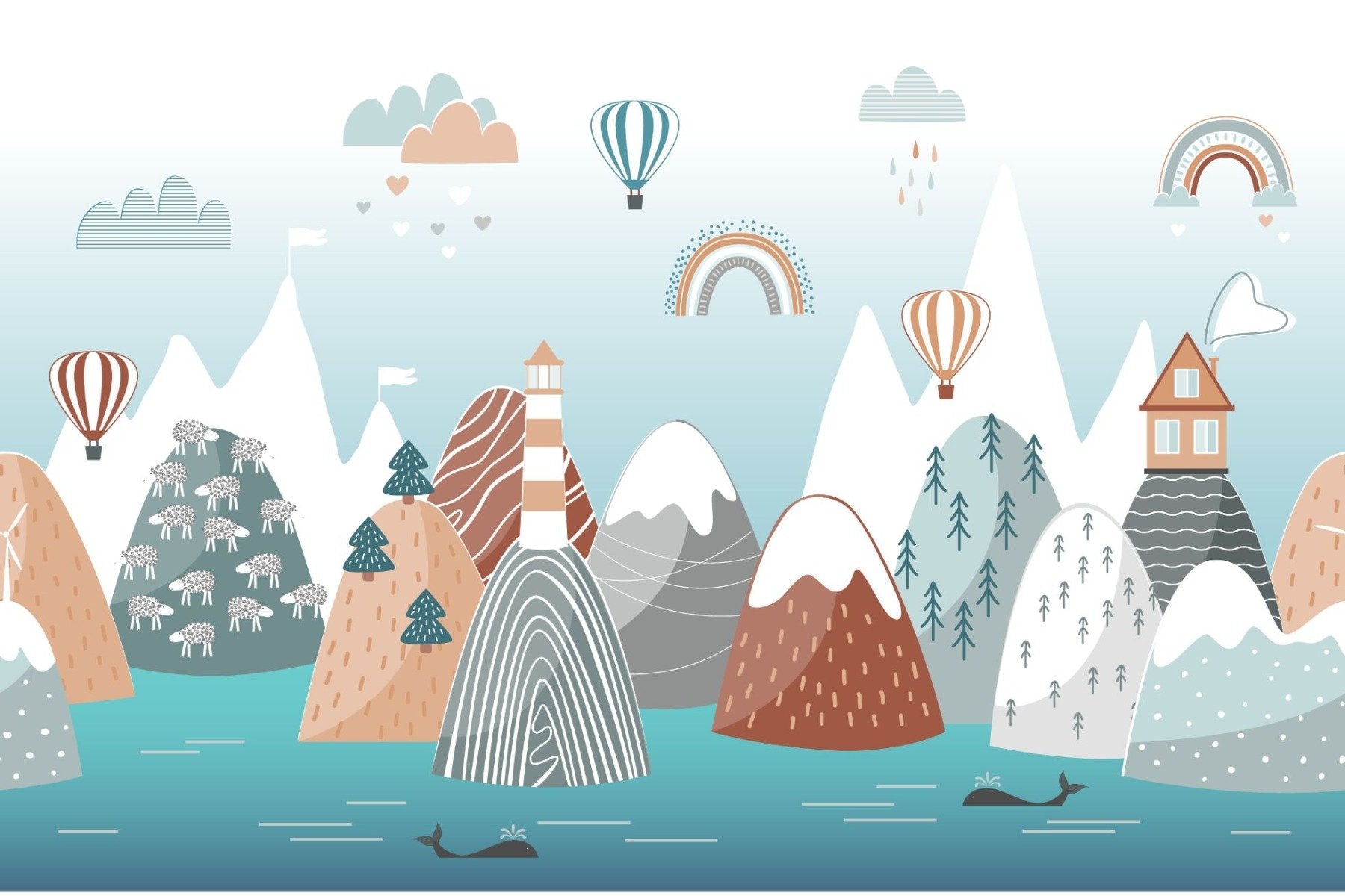 Kids wallpaper with whimsical mountains and sea