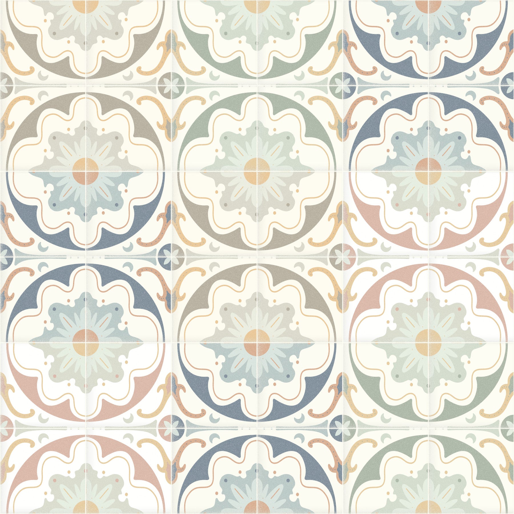 Embrace the charm of vintage design with our Aged Cement Tile Backsplashes Mixed Colors wallpaper. This design evokes the warmth and character of handcrafted cement tiles, artfully aged for an authentic, lived-in feel. A repeating floral motif in subtly contrasting pastel hues – soft blues, gentle greens, warm grays, and delicate peaches – creates a visually captivating mosaic. The varied palette adds depth and interest, while the aged texture provides a tactile illusion, lending a sense of history and timeless elegance to your space. Perfect for kitchens, bathrooms, or any area needing a touch of rustic sophistication, this wallpaper effortlessly blends classic artistry with contemporary style, transforming your walls into a statement piece.